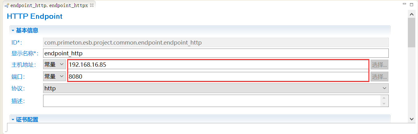 参数 说明 ID HTTP Endpoint创建时自动生成,不可修改。 显示名称 HTTP Endpoint的显示名称,由数字、字母、中文、点(.)、下划线(_)、中横线(-)组成。当在Developer中设置为"使用显示名"时,该Endpoint显示该名称。 主机地址 HTTP Endpoint连接的服务器地址,必填。 端口 HTTP Endpoint连接的服务器端口号,范围从1025到65535。 协议 服务器提供的HTTP协议类型,支持http和https。 HTTP Endpoint配置完成后,单击工具栏中的保存图标。