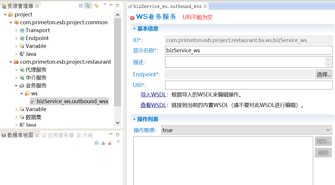 单击“完成”,在打开的“WS业务服务”的编辑界面中,需要选择Endpoint和填写URI信息,如下图所示。