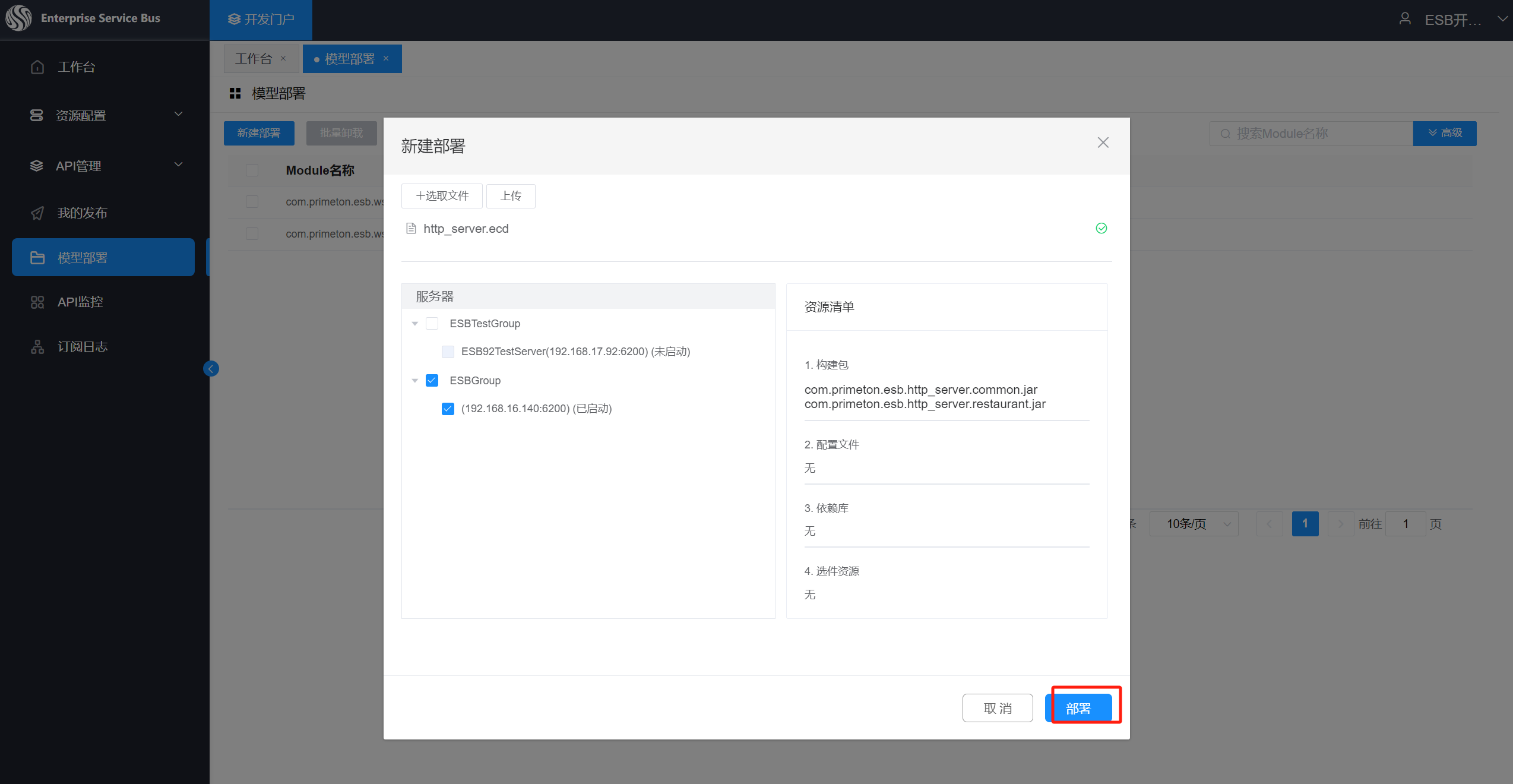 使用开发账户登录开发门户,单击左侧导航树上的 “模型部署 >新建部署” ,弹出 “新建部署” 界面。