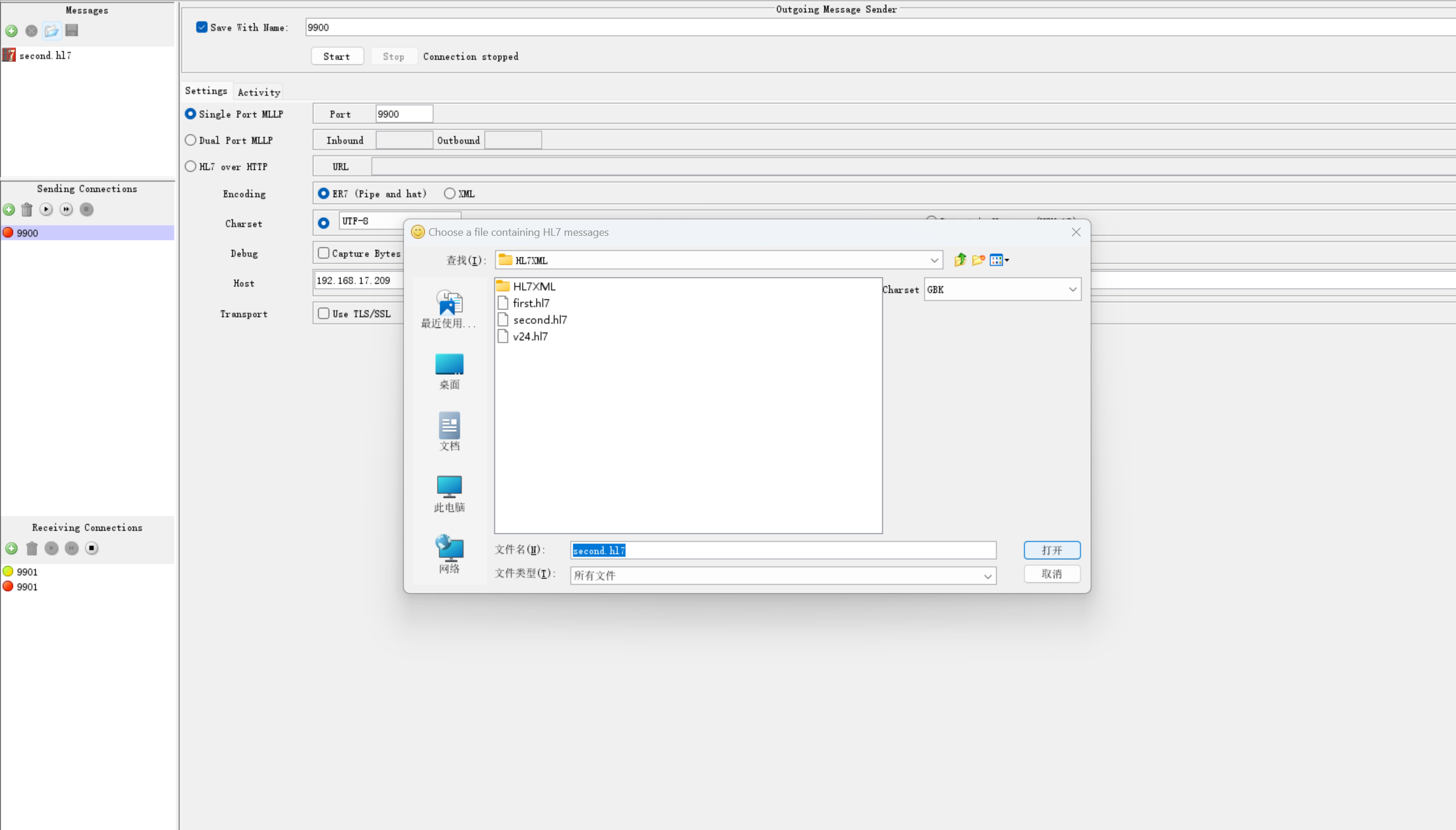 3.在messages窗口添加发送的HL7消息文件,如图所示。消息文件: second.hl7。