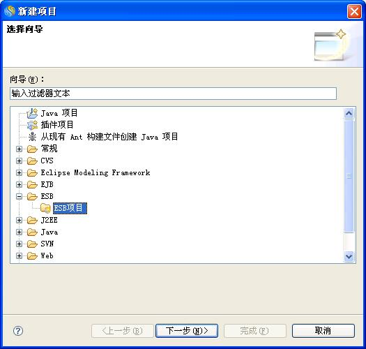打开ESB Studio,进入ESB开发平台。点击ESB Studio工具条上的【文件->新建->项目】,在弹出的对话框中选择"ESB->ESB项目",如下图所示: