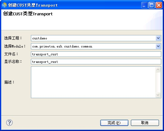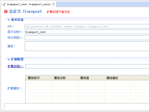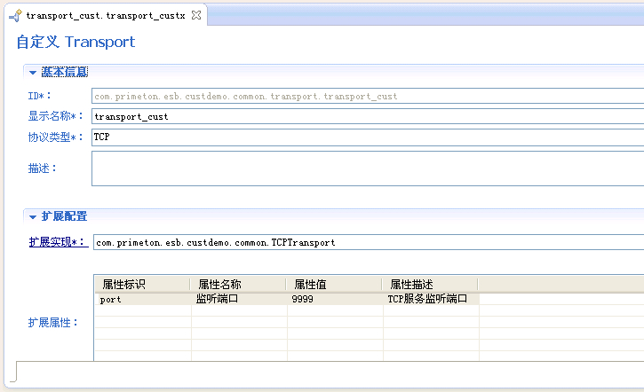 点击【完成】,在资源管理器中产生"transport_cust.tansport_custx",并在中间编辑器中显示出具体的信息。配置如下图所示,填写必要信息并保存 。