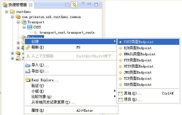 点击【完成】,在资源管理器中产生"bizService_cust.outbound_custx",并在中间编辑器中显示出具体的信息。点击"Endpoint*"后的【选择...】,选择刚创建的CUST类型的Endpoint:com.primeton.esb.custdemo.common.endpoint.endpoint_cust