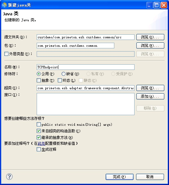 输入协议类型为TCP,点击"扩展实现*"链接,打开类创建窗口,填写类名称TCPTransport,此类必须继承com.primeton.esb.adapter.framework.component.AbstractTransportComponent