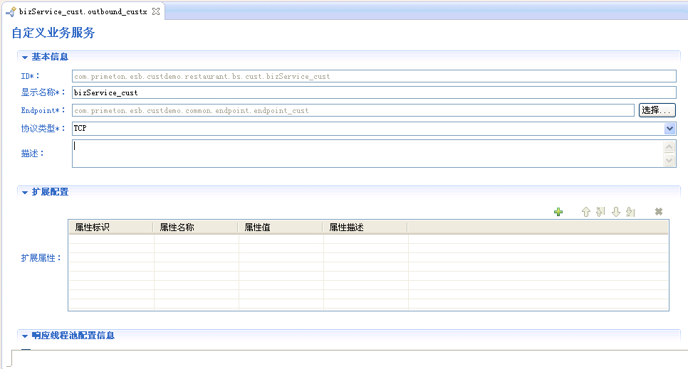 - 响应线程池配置信息:为提升ESB消息处理能力,在消息接收处配置了线程池机制,是性能调优的核心配置之一。本教程案例统一采用全局配置,有关这部分的介绍可以参见产品联机帮助《ESB开发指南-使用指南-运行参数配置-线程池配置》。