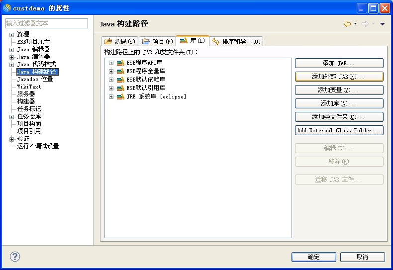 在studio下开发扩展类实现,如果用到相应的第三方jar包,需要将相应jar包配置到classpath中。在custdemo项目打开右键菜单,选择属性, 在打开的配置面板中点击左边导航栏中"【Java构建路径】"按钮,然后选中"【库】"选项卡,点击"【添加外部JAR(X)】",将第三方jar包配置到classpath。