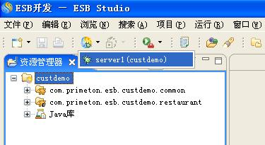 在开发环境中安装的ESB Studio内置了ESB Server,服务开发完后可以自动以文件形式部署到ESB Server中,直接可以测试运行。 运行时需要将第三方拷贝至esb安装目录\server\libs下,选择server1(custdemo)运行。如下图所示: