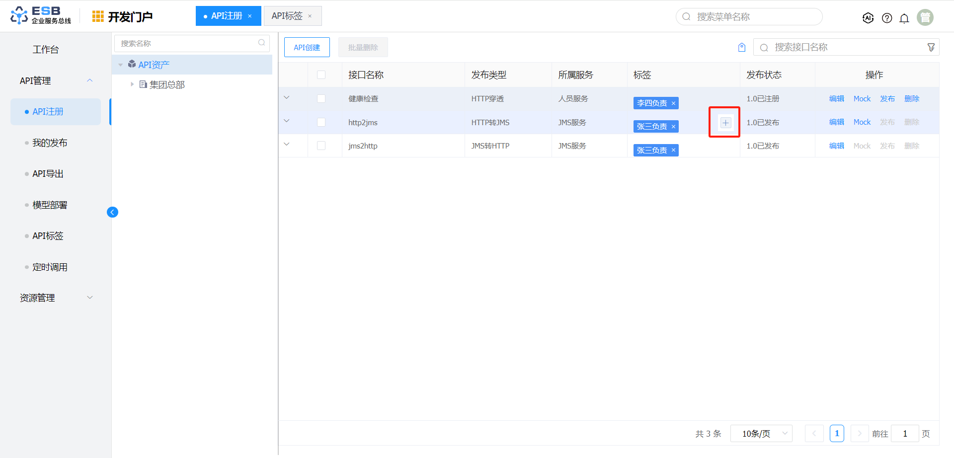 开发人员登录系统,进入开发门户,点击菜单“API管理”>“API注册”,打开API注册管理界面,左侧显示组织树结构(包括域、系统、服务),右侧显示已创建的API列表。