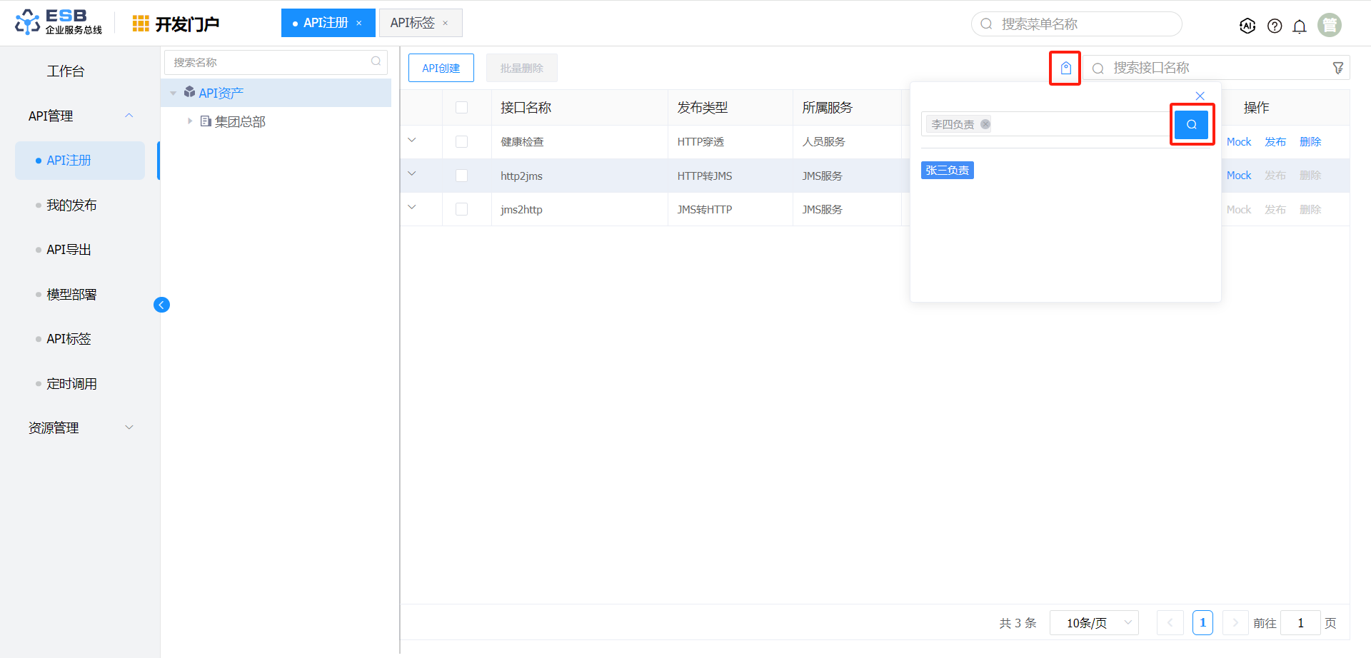 在“API注册”界面,选择左侧组织树中API所属节点,点击标签查询按钮,选择标签,点击“搜索”图标,显示符合条件的API接口列表。