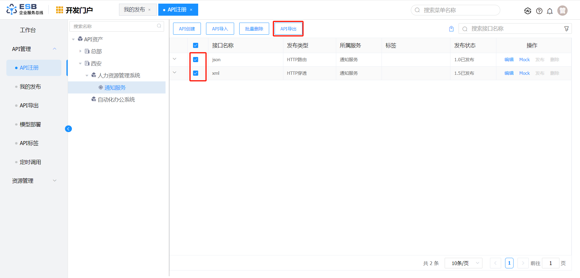 在“API注册”界面,选择左侧组织树中API所属服务节点,勾选需要导出的API接口,点击“API导出”按钮,即可导出API接口文件。