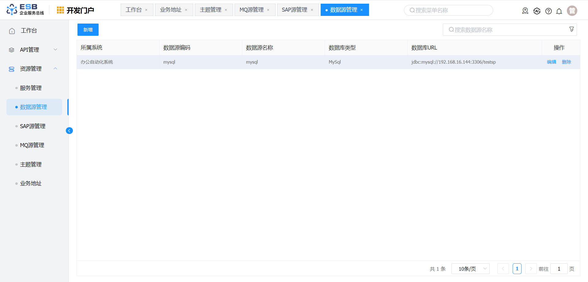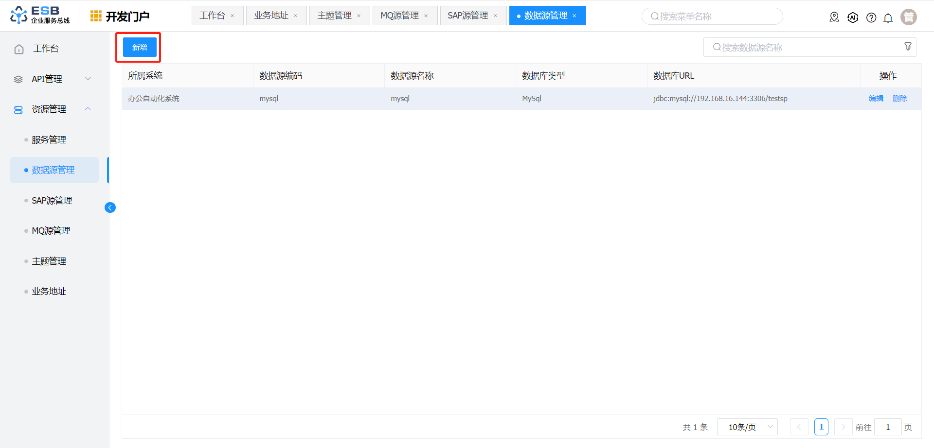 开发人员登录系统,进入开发门户, 点击菜单“ 资源管理“ >” 数据源管理 ” ,右侧区域显示 “数据源管理” 界面。