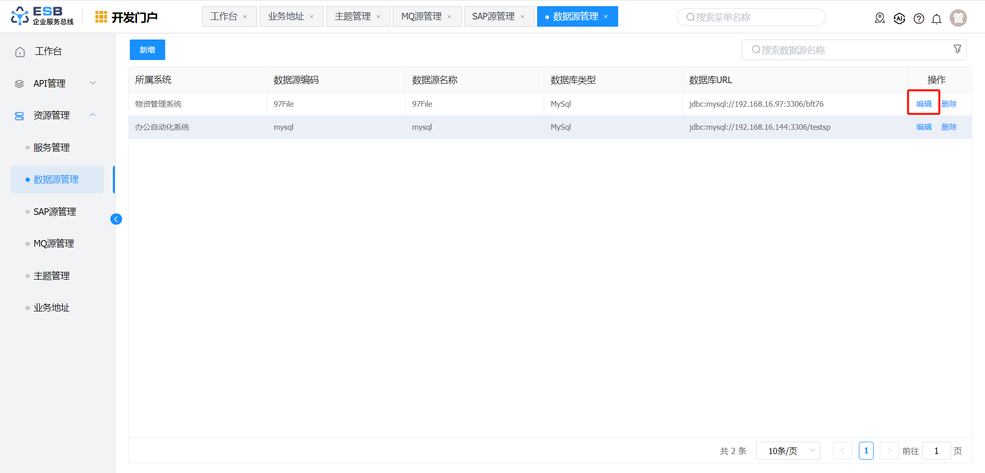 在“数据源管理”界面,选择一条需要修改的数据源记录,点击操作列“编辑”按钮,进入“编辑数据源”界面。