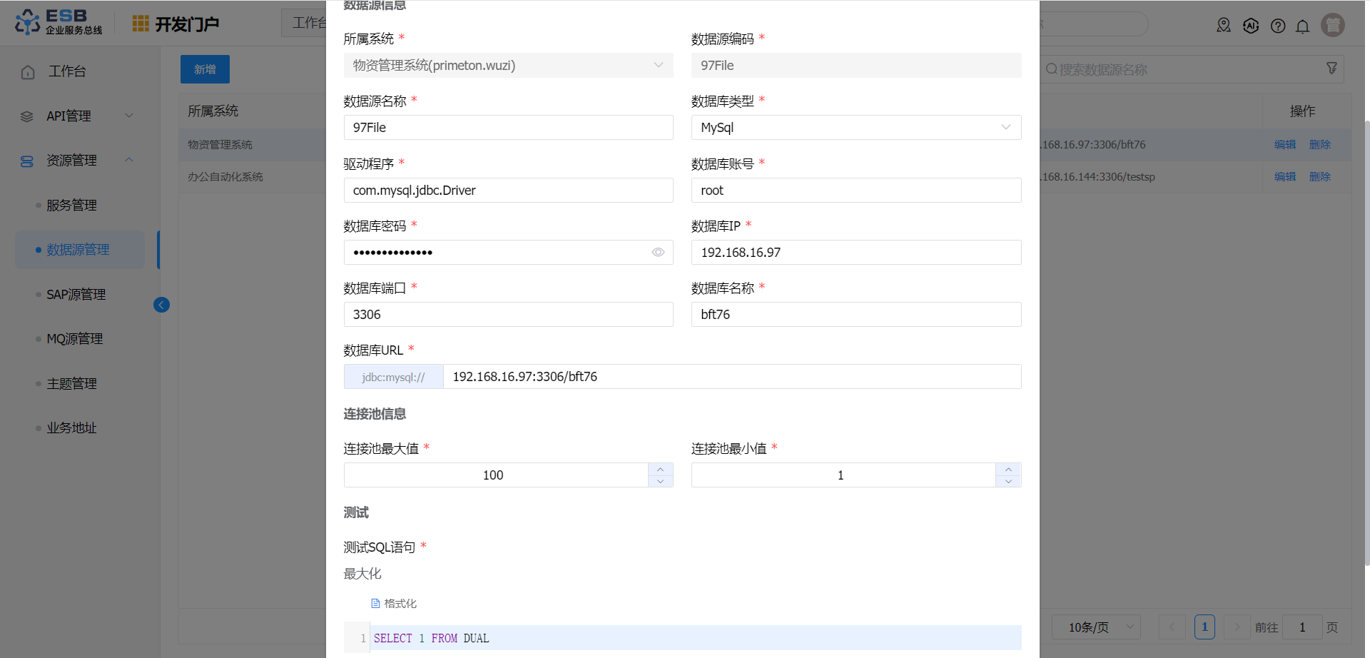 参数 说明 所属系统 数据源所属系统 数据源编码 数据源编码 数据源名称 数据源名称 数据库类型 数据库类型 驱动程序 驱动程序,数据库类型选定后自动填写 数据库账号 数据库账号 数据库密码 数据库密码 数据库IP 数据库IP地址 数据库端口 数据库端口 数据库名称 数据库名称 Schema 数据库Schema 数据库URL 数据库URL,更具数据库信息自动填写 连接池最大值 数据库连接池最大值 连接池最小值 数据库连接池最小值 测试SQL语句 用于测试数据库联通性的SQL语句
