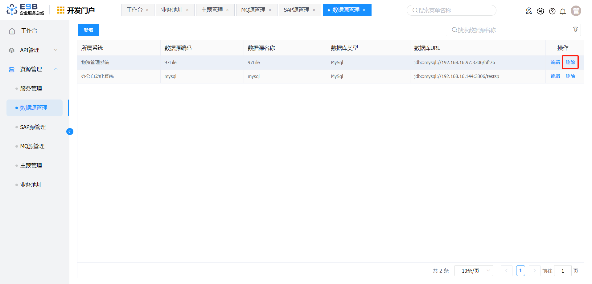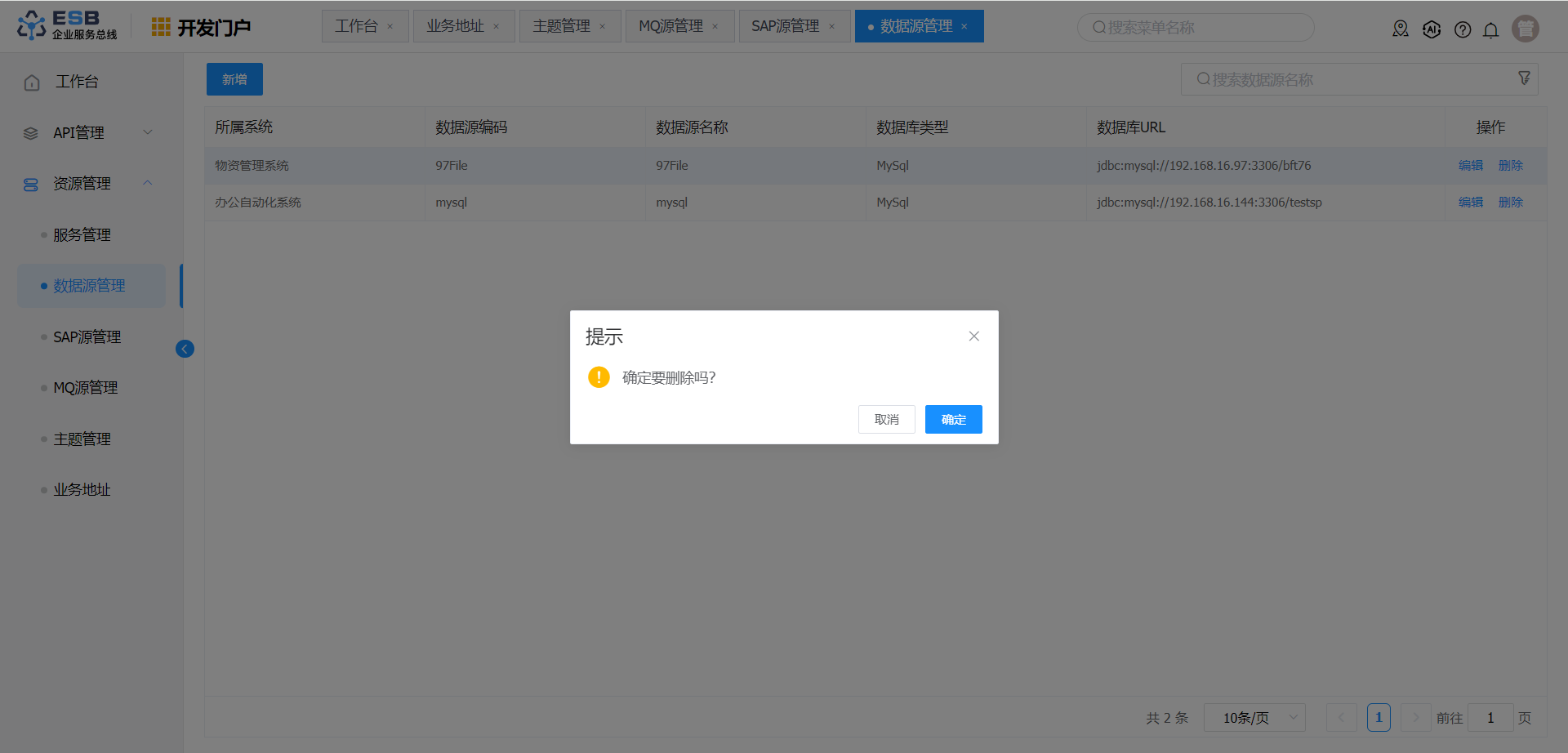 在“数据源管理”界面,选择一条需要删除的数据源记录,点击操作列“删除”按钮,弹出删除确认提示框。