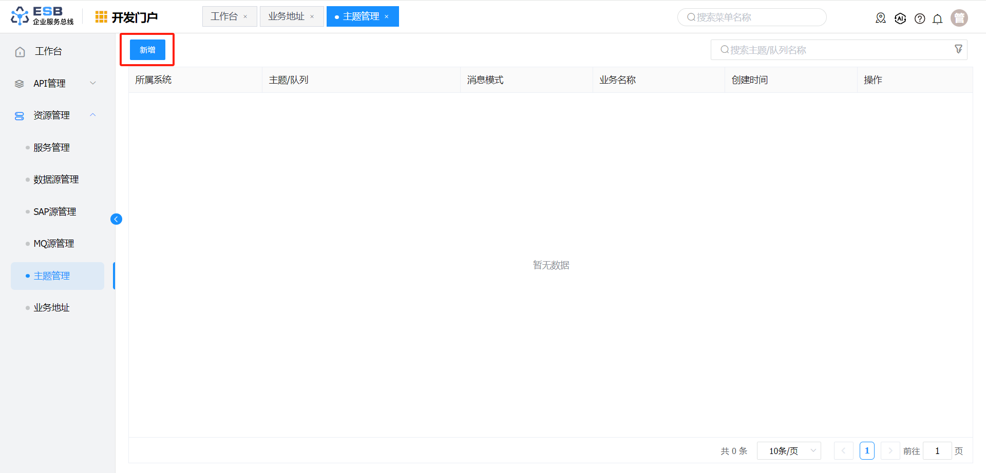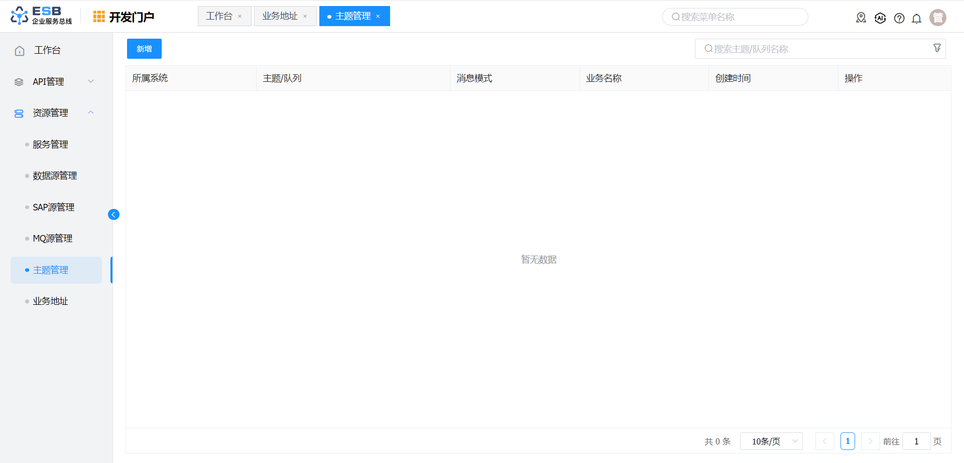 开发人员登录系统,进入开发门户, 点击菜单“ 资源管理“ >”主题管理 ” ,右侧区域显示 “主题管理” 界面。
