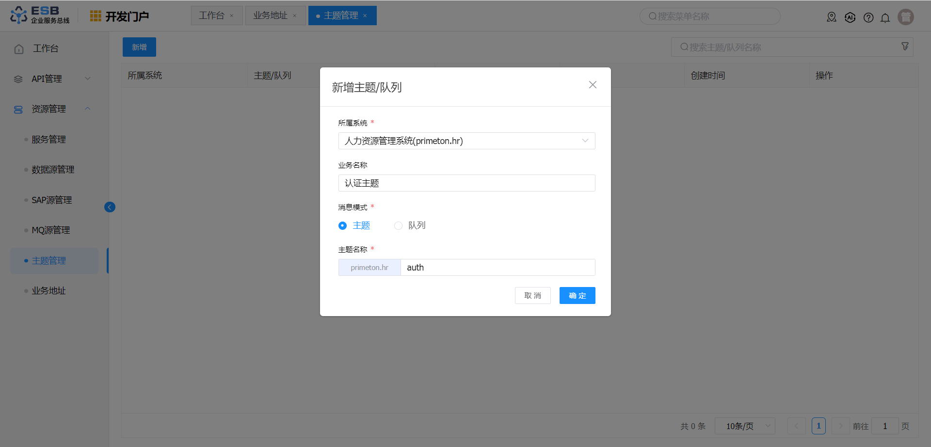 在 “主题管理” 界面,点击“新增”按钮,进入“创建主题/队列”界面。