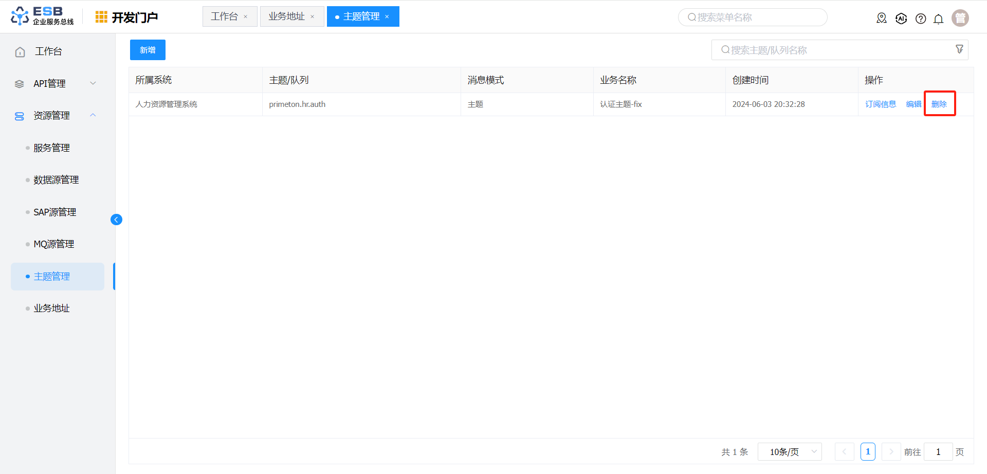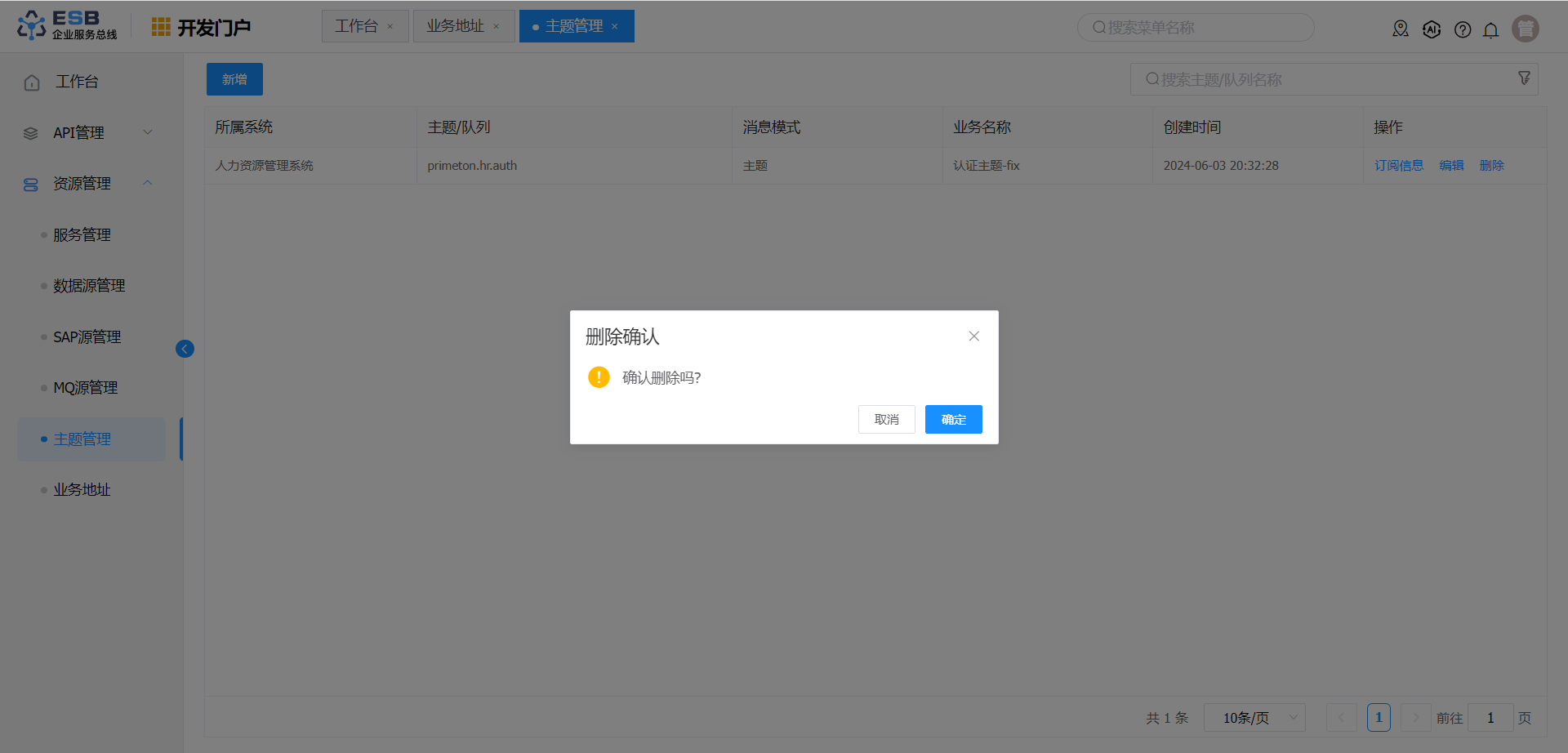 在“主题管理”界面,选择一条需要删除的主题记录,点击操作列“删除”按钮,弹出删除确认的提示框。