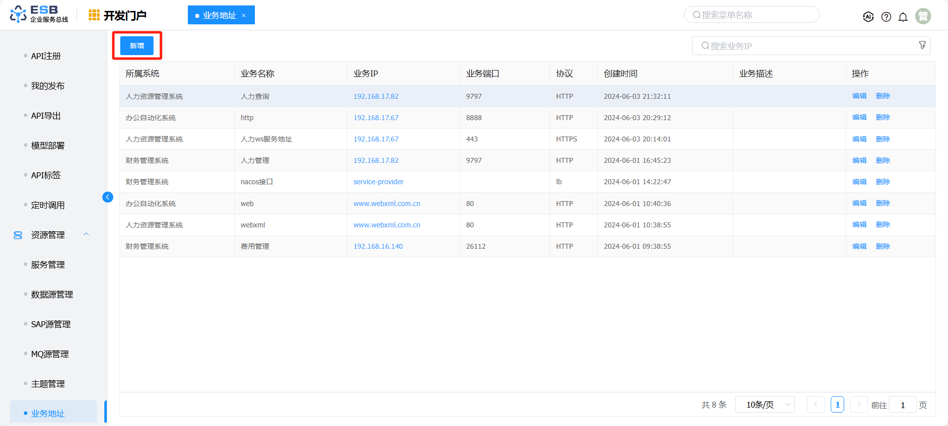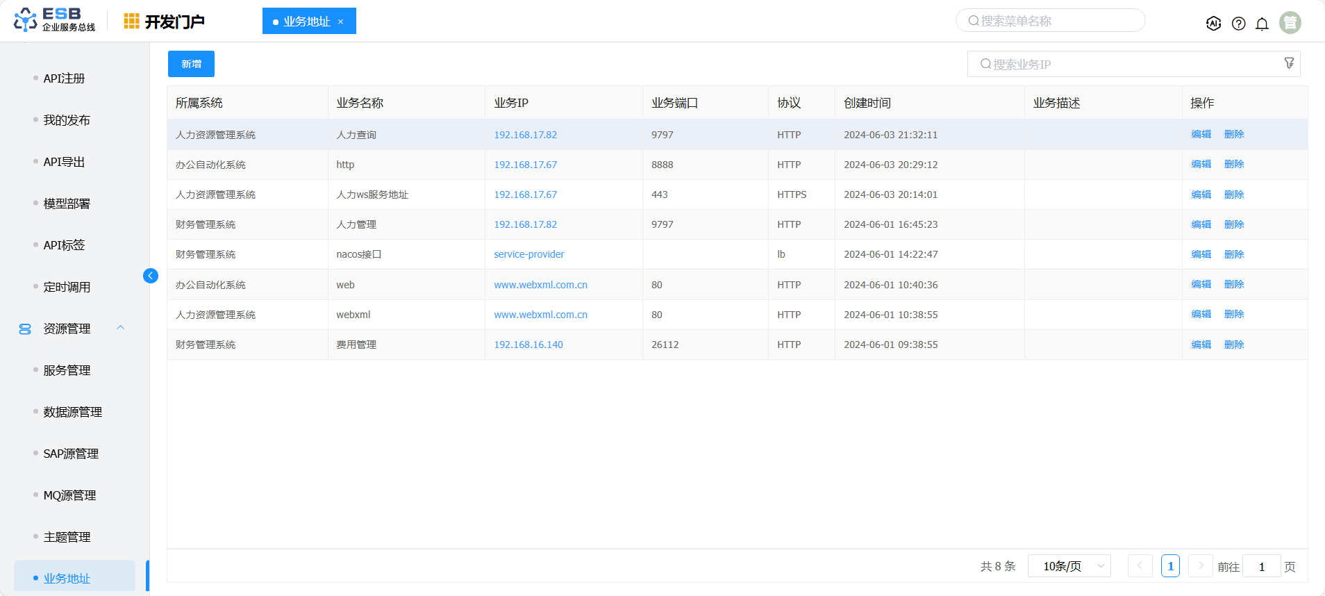 用于管理业务服务地址,可查看已经通过服务注册的接口功能创建的业务服务地址。