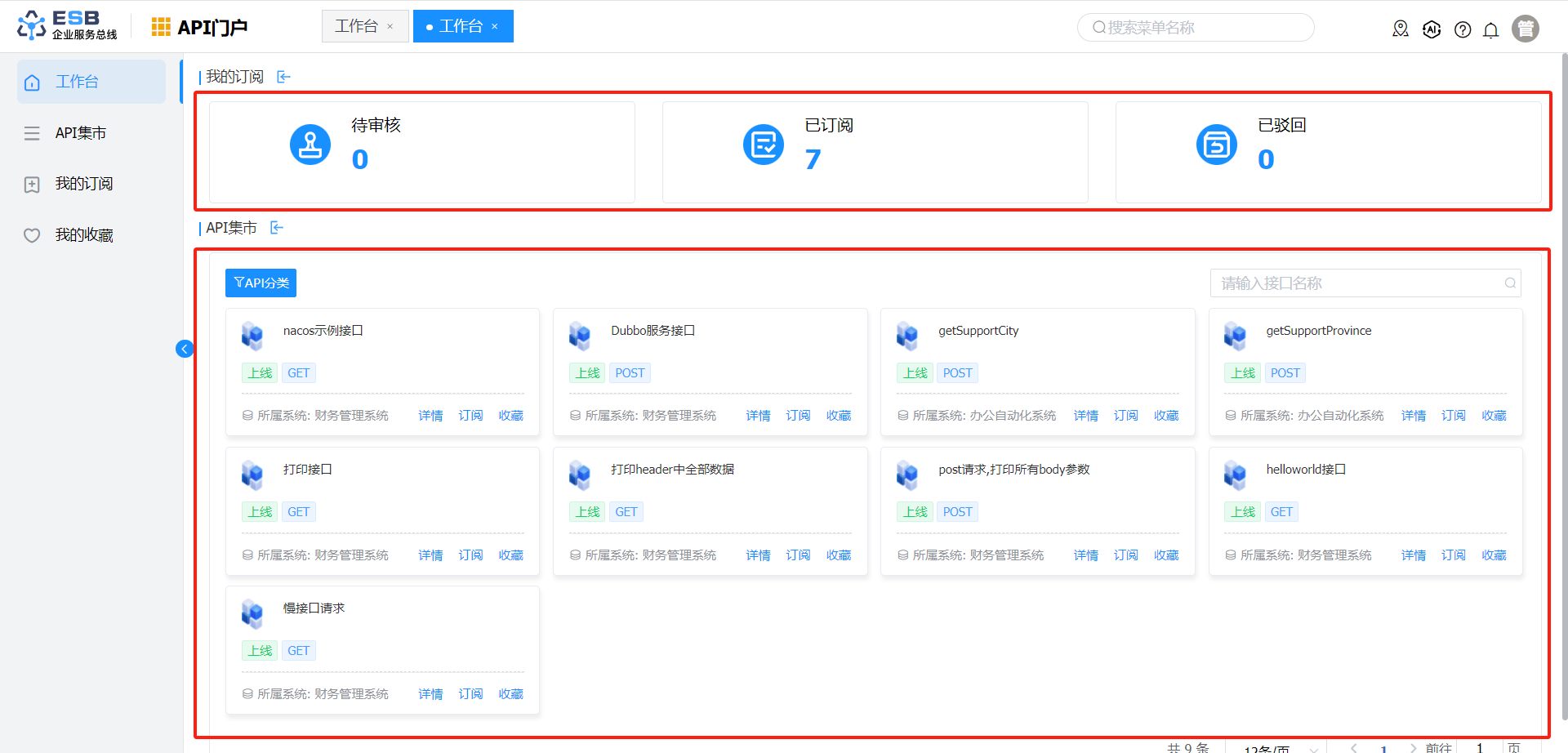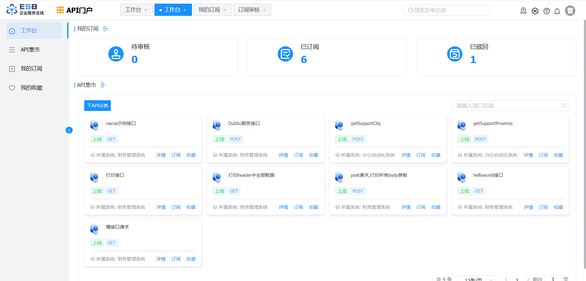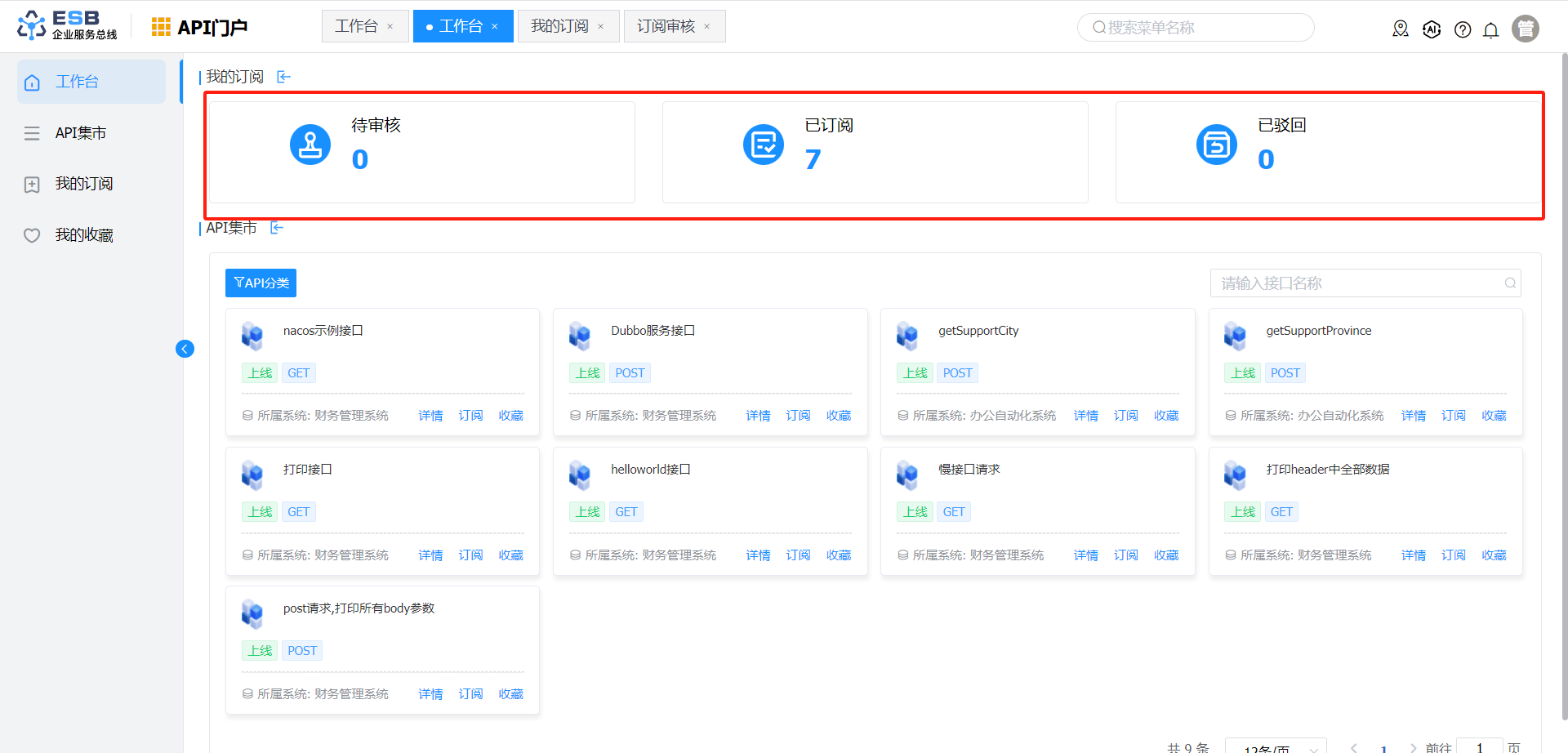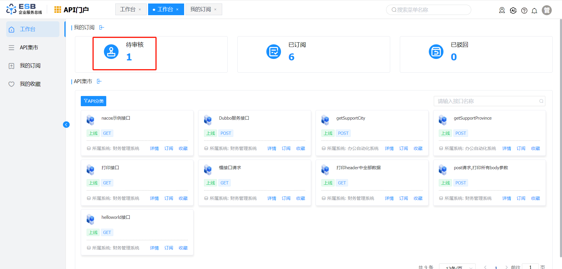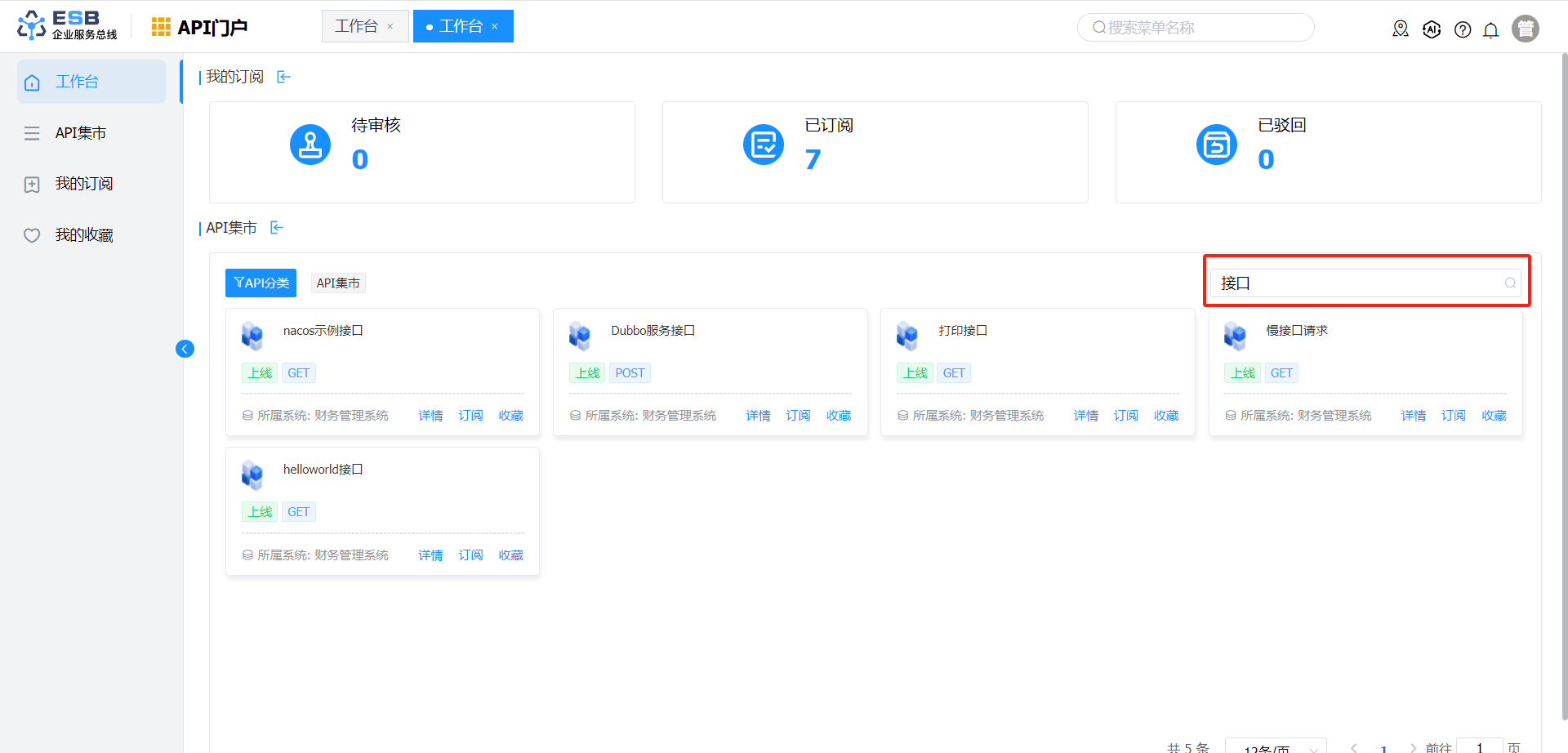消费方用户登录系统,点击API门户,进入API门户的“工作台”页面。工作台页面主要分为两部分内容,第一部分用于统计展示当前用户的接口订阅信息,也可点击对应卡片跳转至我的订阅查看具体信息,第二部分主要包含以下内容: 接口检索、查看接口详情、接口订阅、接口收藏。