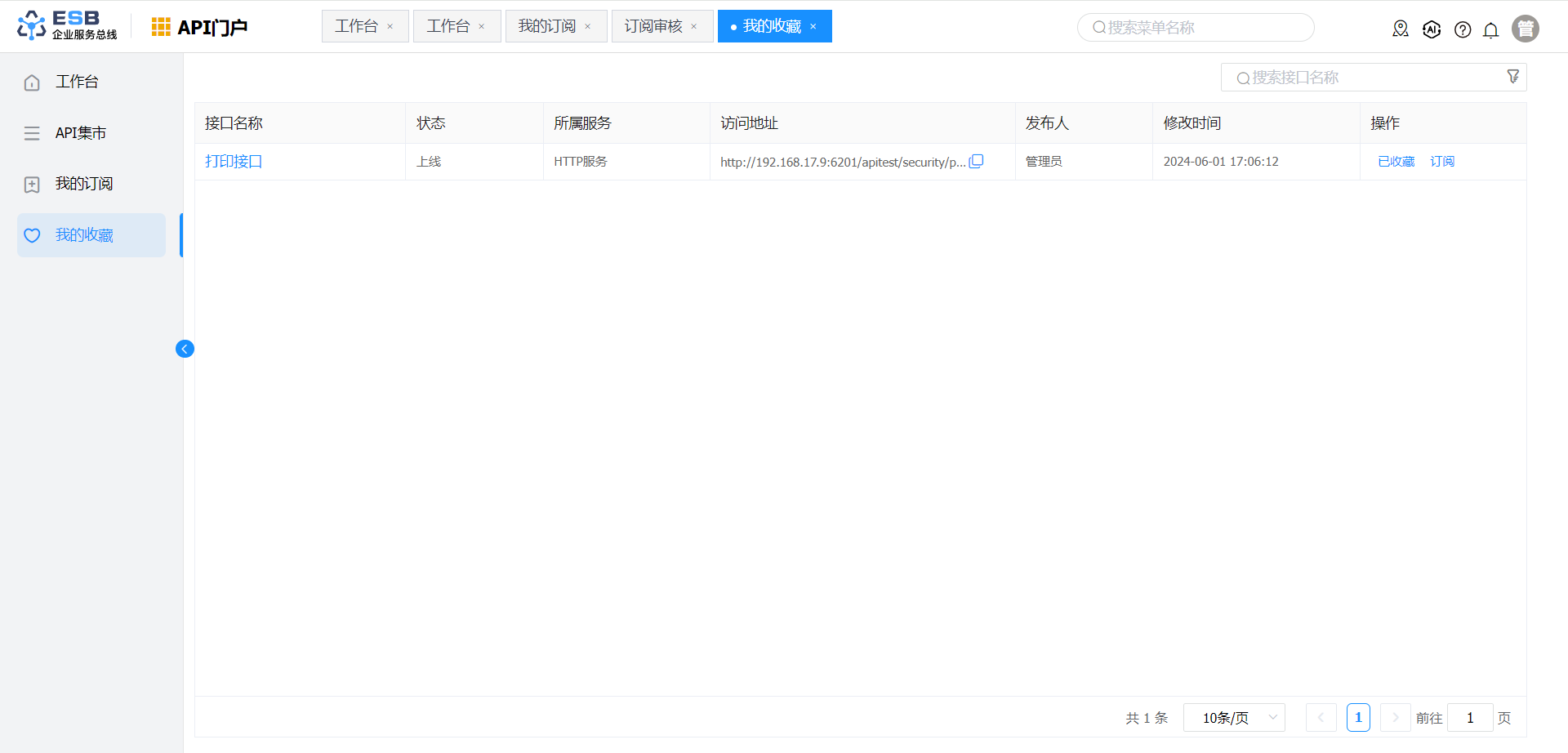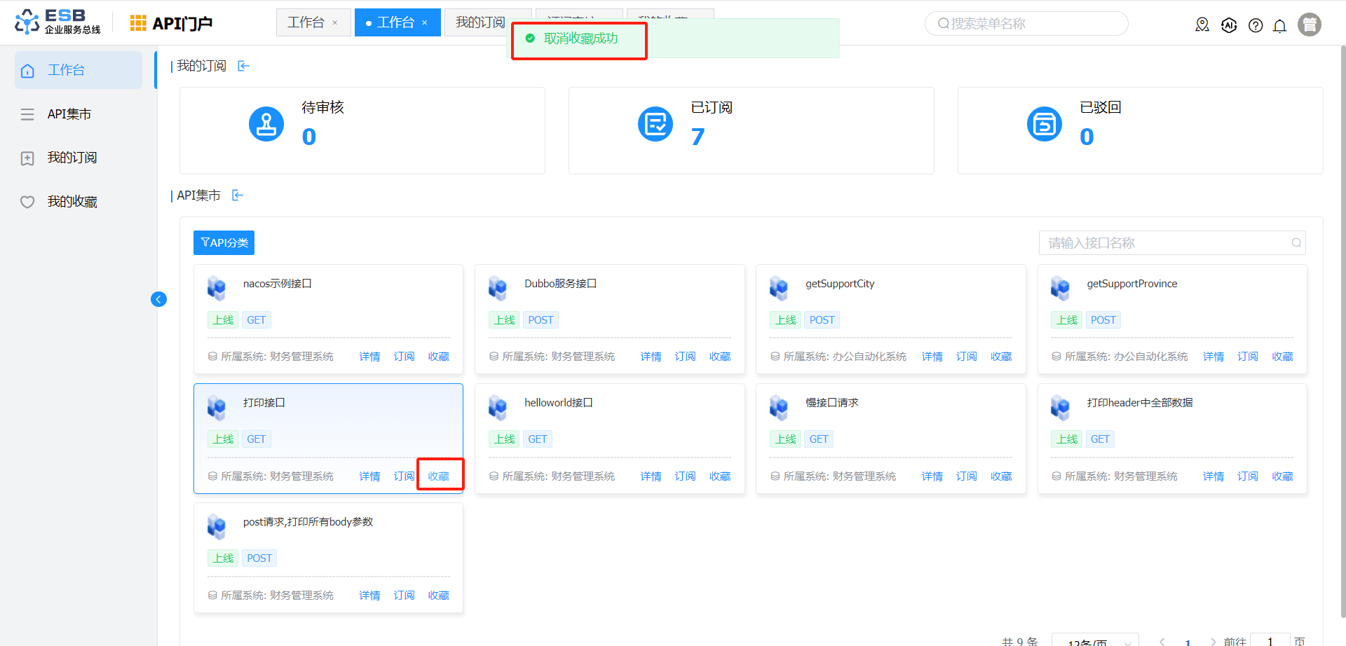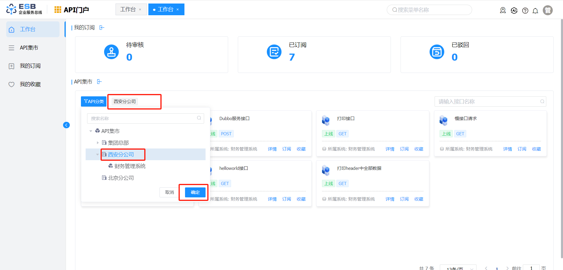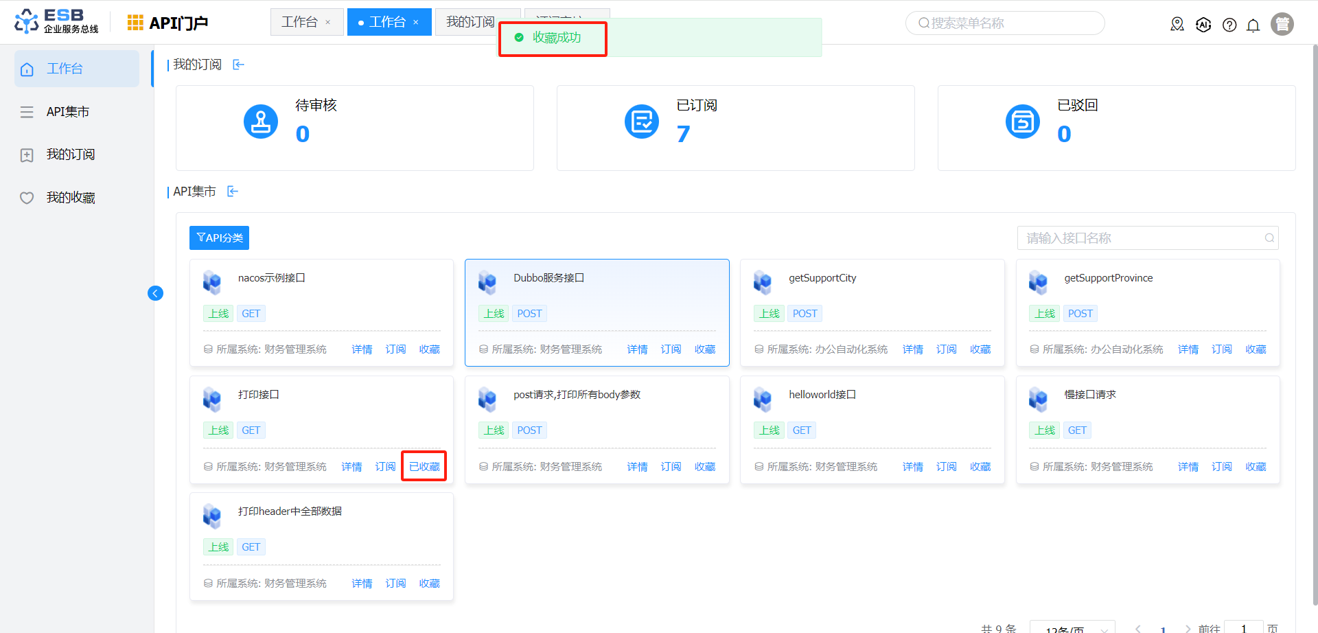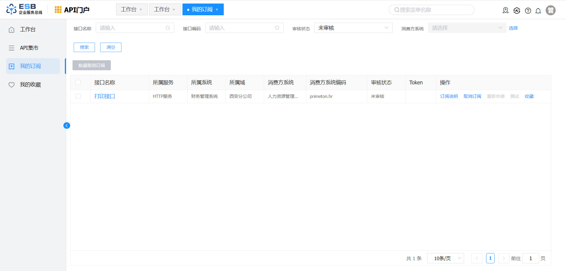 消费方用户登录系统,点击API门户,进入API门户的“工作台”页面。工作台页面主要分为两部分内容,第一部分用于统计展示当前用户的接口订阅信息,也可点击对应卡片跳转至我的订阅查看具体信息,第二部分主要包含以下内容: 接口检索、查看接口详情、接口订阅、接口收藏。