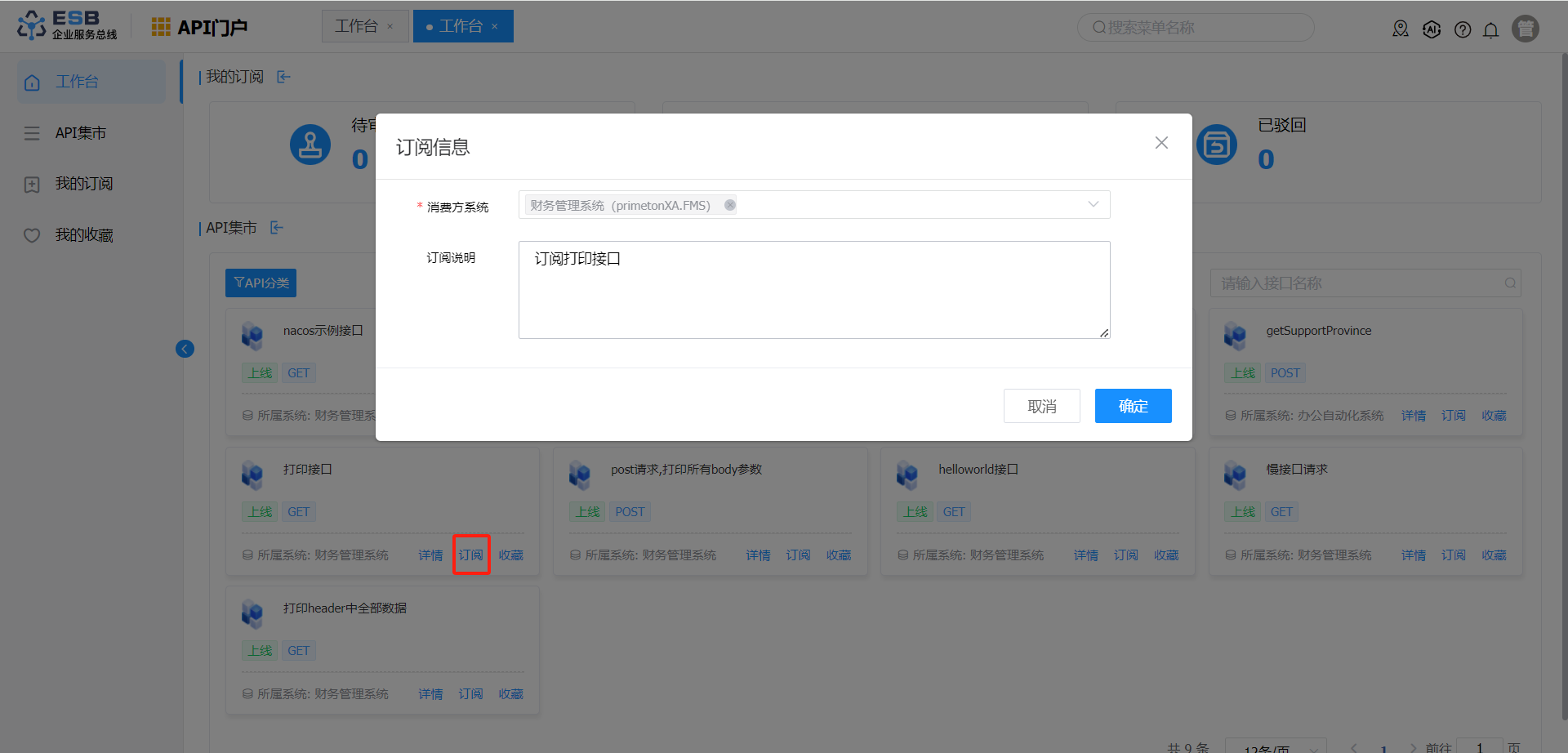 接口订阅是消费方人员最关注的功能,具体操作步骤为:点击订阅按钮->在下拉列表中选择消费方系统(可多选)->填写订阅说明->点击确定。