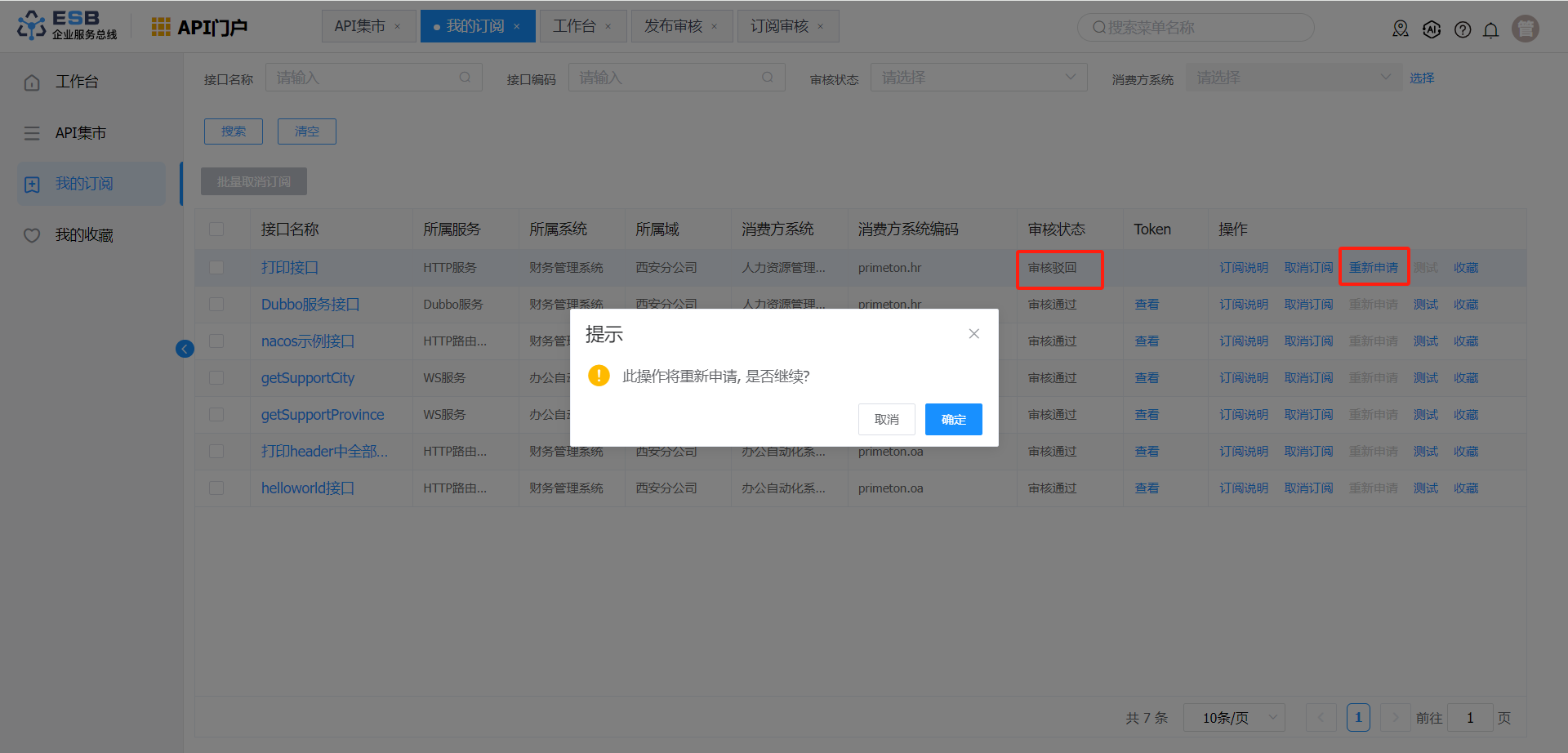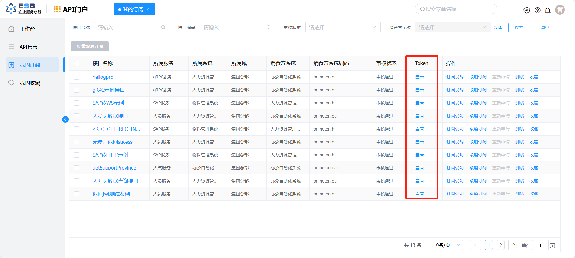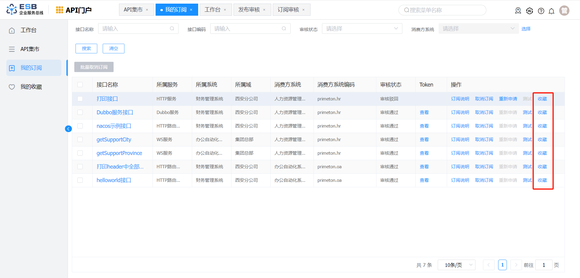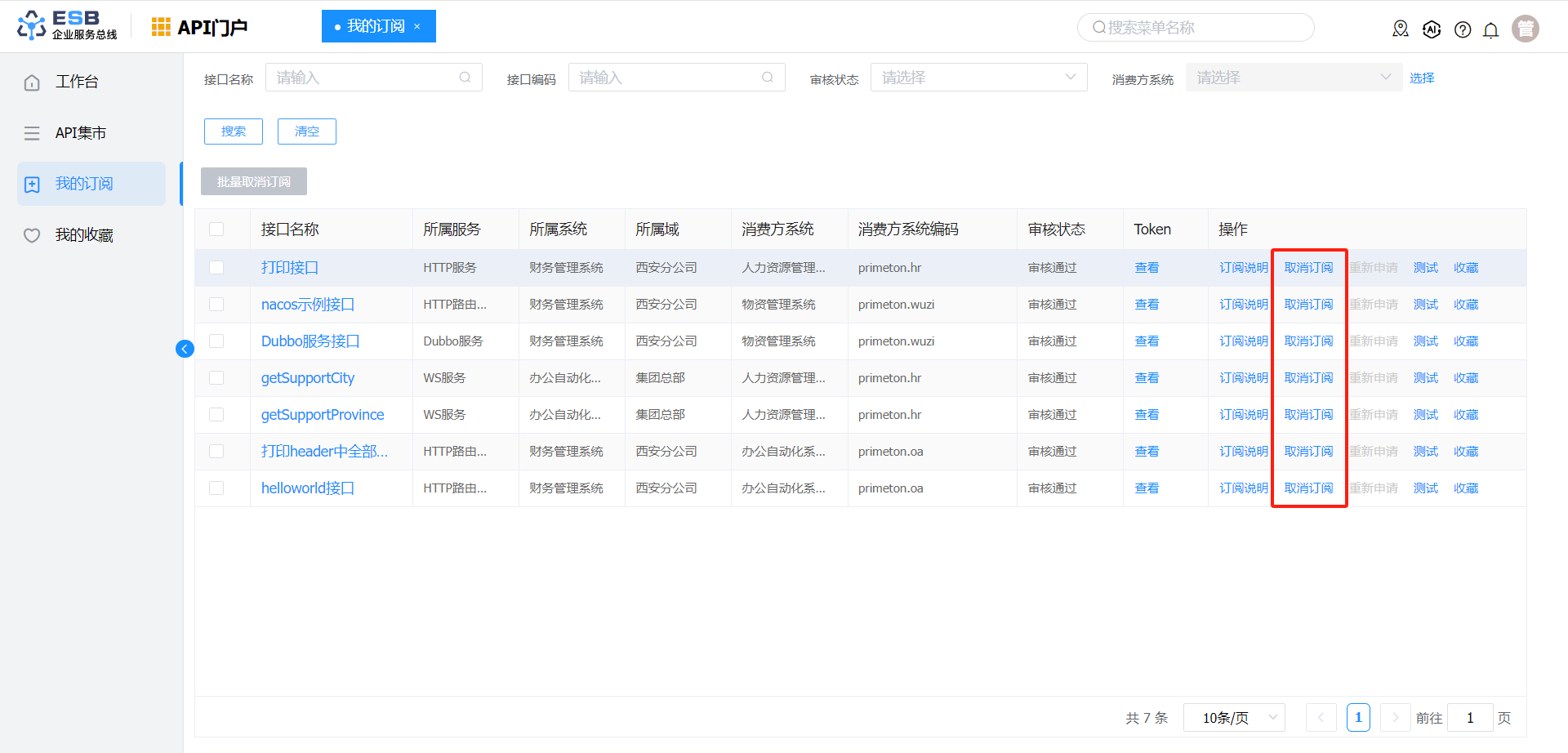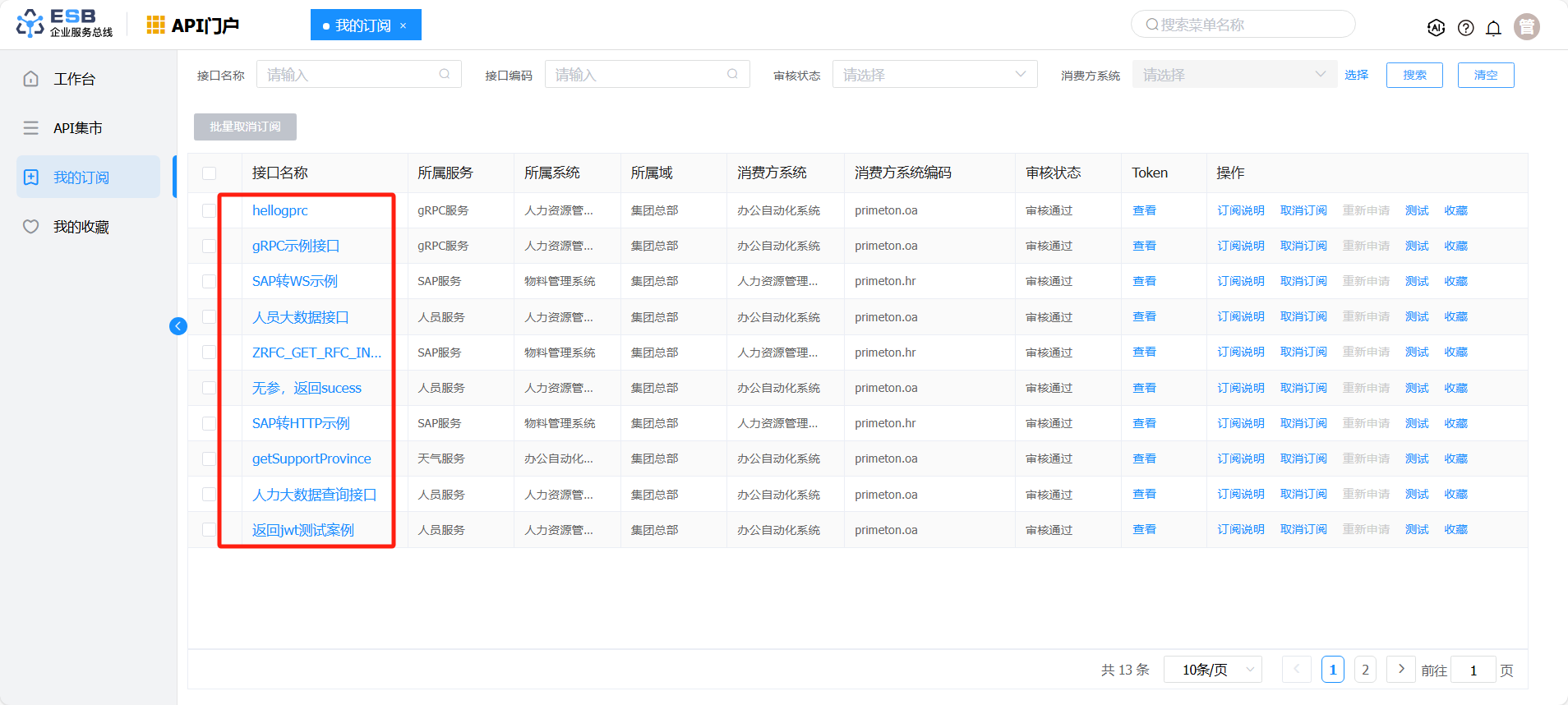 在 API门户,点击菜单“我的订阅”,点击接口进行订阅,也可取消订阅,如接口订阅申请被驳回,可再次申请,也可以批量进行订阅订阅的接口,如改动则会进行邮件通知