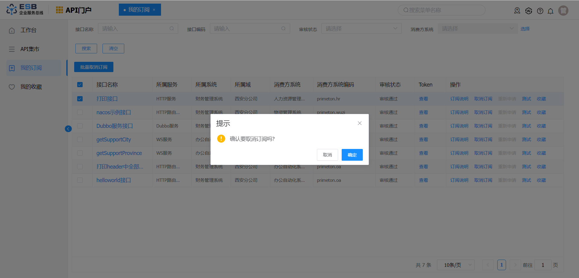 在“我的订阅”页面,选择一条需要取消订阅接口记录,点击操作列“取消订阅”按钮,弹出取消订阅确认框。