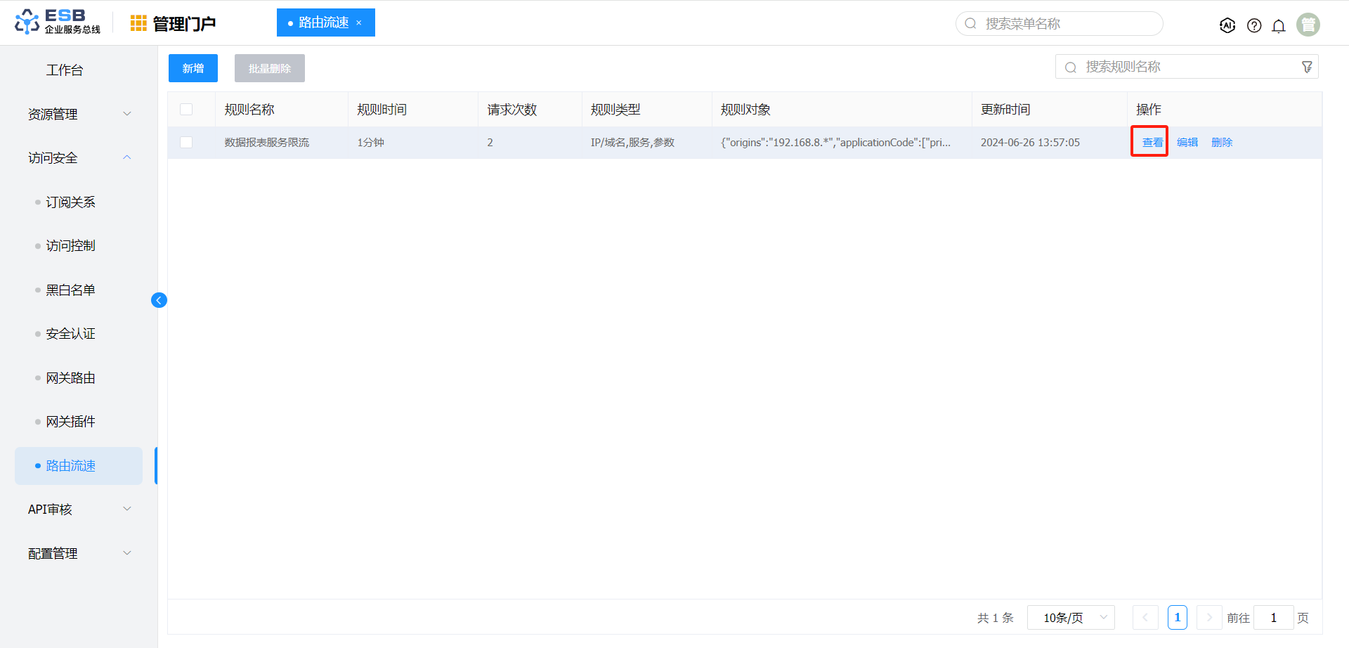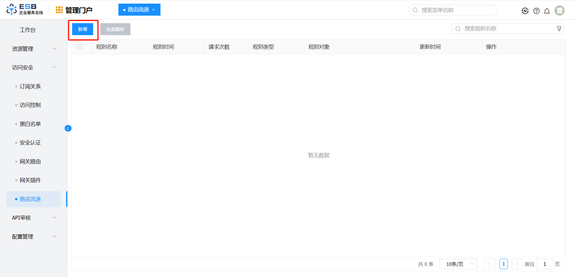 在管理门户 > 访问安全 >路由流速页面,点击上方新增按钮