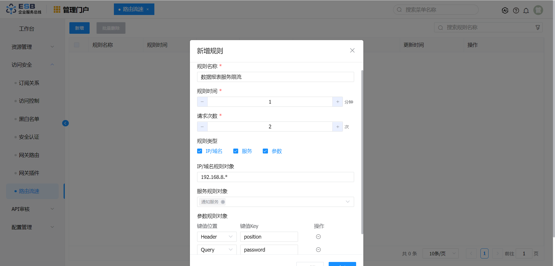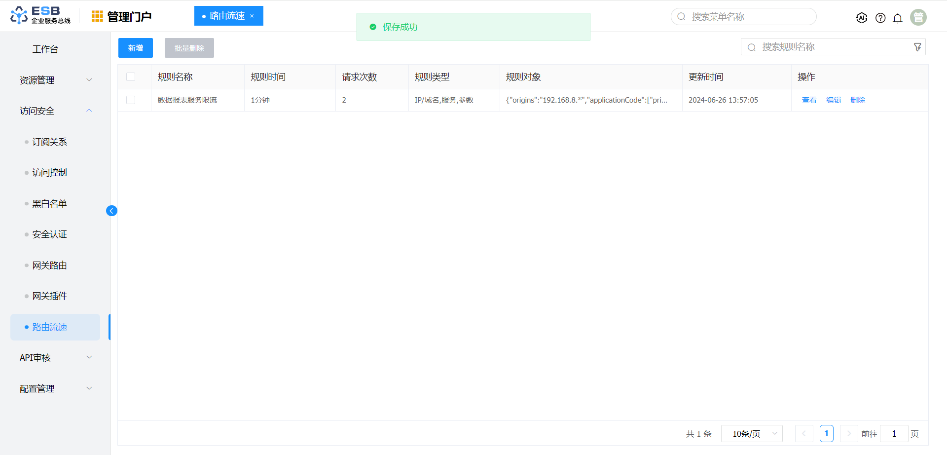 参数 说明 规则名称 限流规则的名称 规则时间 固定窗口的时间大小 请求次数 规定时间内可以访问的次数 规则类型 请求执行规则的条件,若多选类型则都需要匹配 IP/域名规则对象 对ip来源进行配置,支持“,”分隔,支持“*”模糊匹配 服务规则对象 从注册的服务中选择请求来源服务 参数规则对象 对header、query、body参数中是否存在key进行匹配 提示保存成功