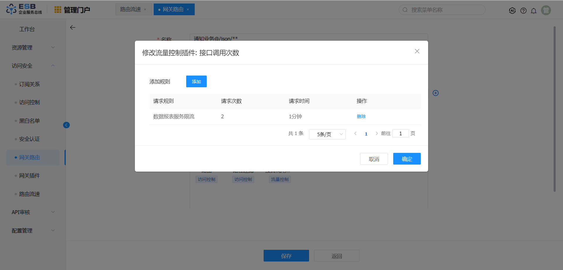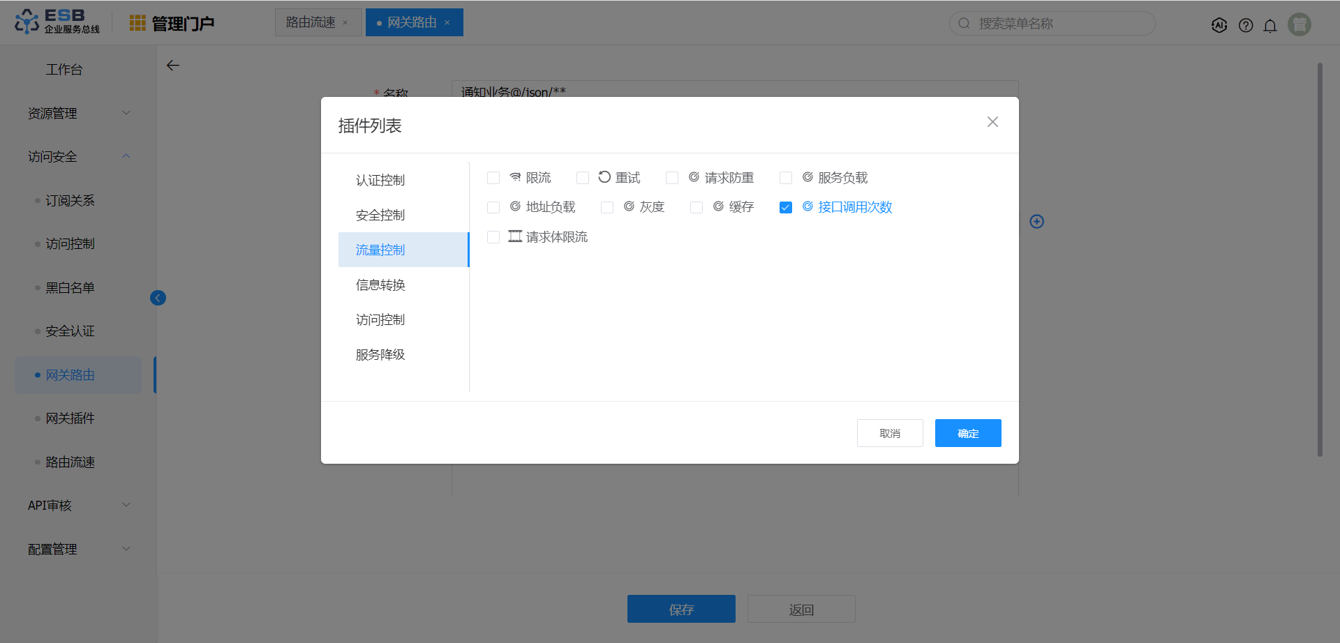 管理门户 > 访问安全 >网关路由页面,点击编辑路由,添加接口调用次数插件