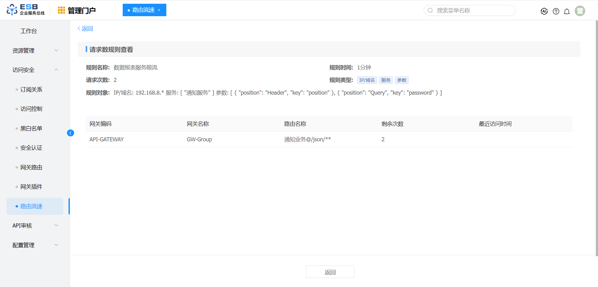 - 可以查看规则在每个路由中的使用情况,因为规则采用固定窗口的方式进行限流,所以可以看到最近一次访问时间和在该窗口期内的剩余访问次数。若规则时间内没有请求,则显示为空。