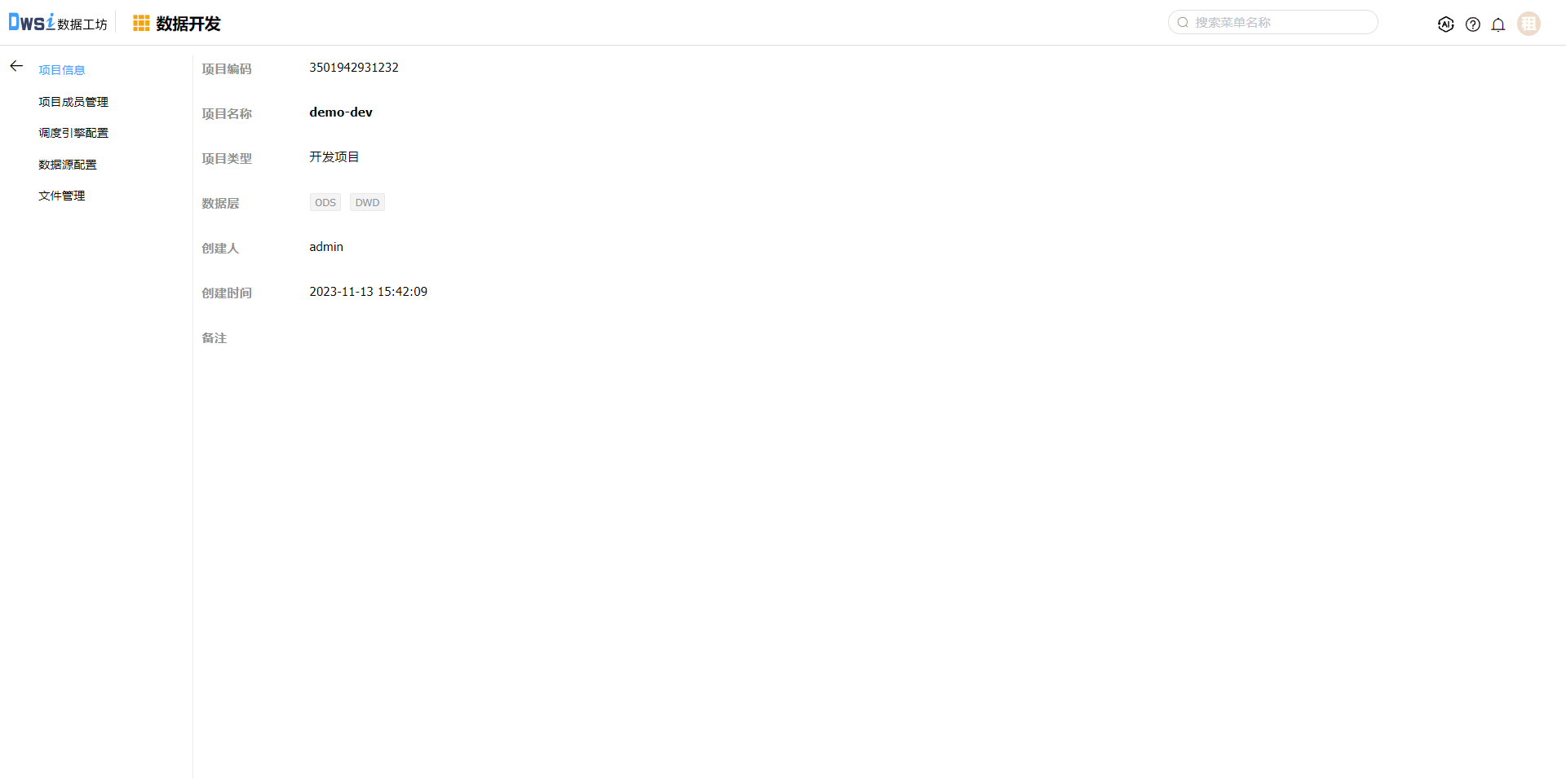 在项目配置中包含:项目信息、项目成员管理、调度引擎配置、数据源配置、文件管理。