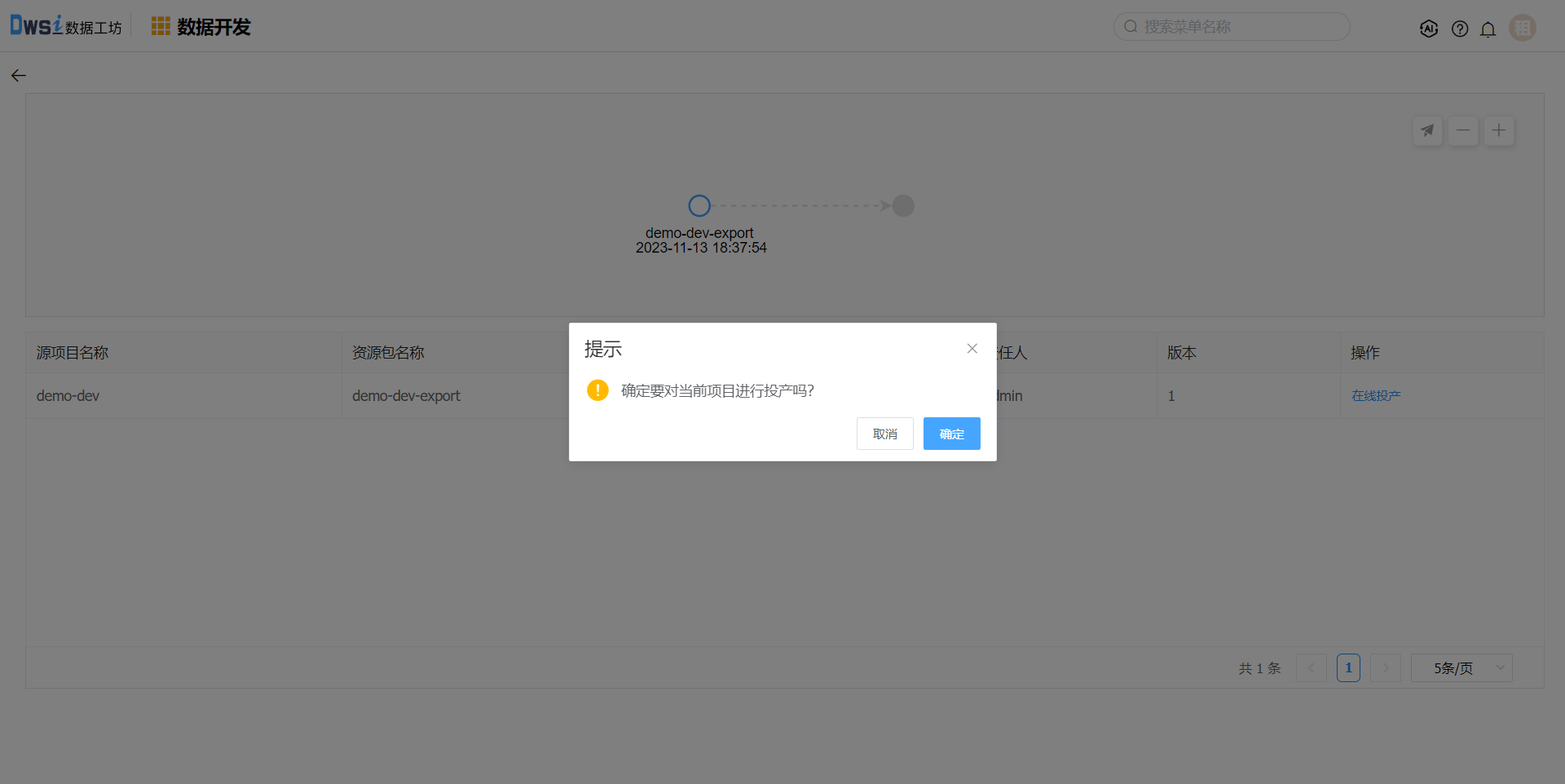 点击上方菜单栏【数据开发】页面,在列表中选择生产项目,点击“项目投产->在线投产”操作。
