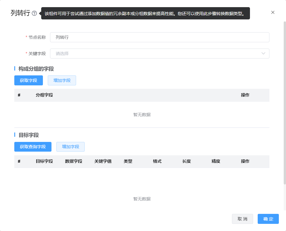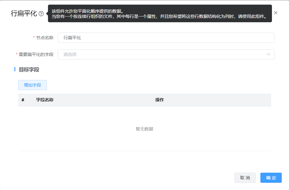 功能介绍:行扁平化允许您平面化顺序提供的数据。当您有一个按连续行组织的文件,其中每行是一个属性,并且您希望将这些行数据结构化为列时,请使用此组件。前置需接排序记录组件。