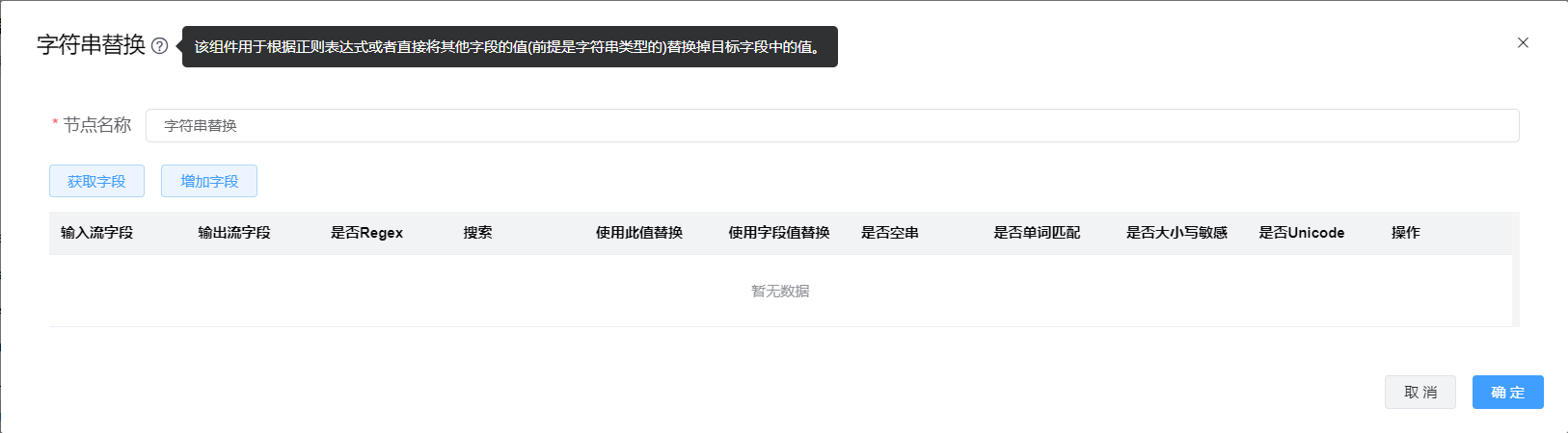 功能介绍:字符串替换用于根据正则表达式或者直接将其他字段的值(前提是字符串类型的)替换掉目标字段中的值。