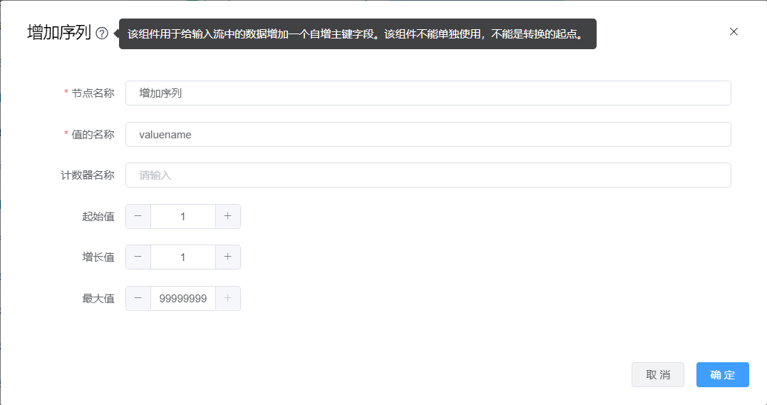 功能介绍:增加序列用于给输入流中的数据增加一个自增主键字段。