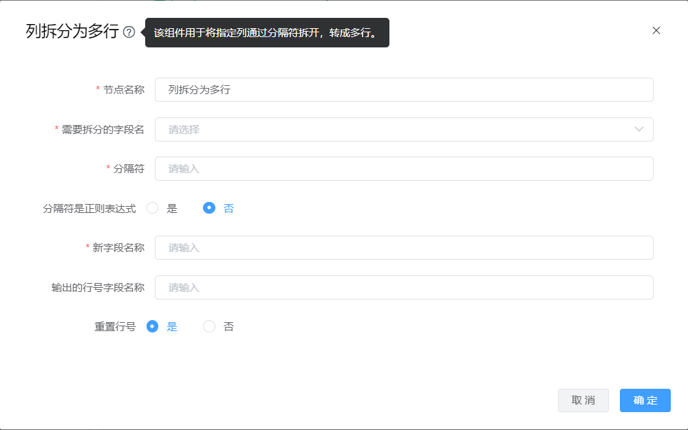 | 重置行号 | 是否重置行号。重置每行数据行号。例如:该行拆分字段数据为aa;bb,使用;进行拆分,那么输出行号为1,2,在处理下一行数据时,行号会重新从1开始计算 |