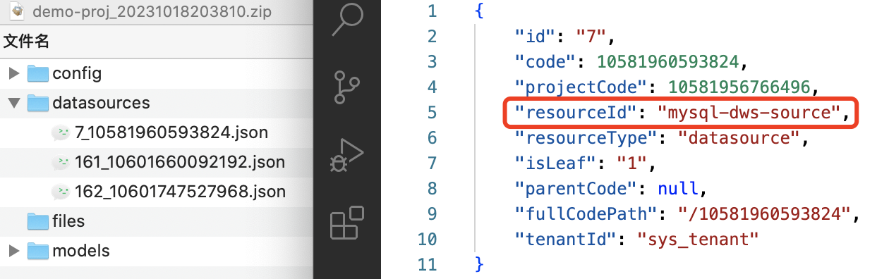 • 导出的资源包确保其中的数据源 Code 在目标环境中已配置(示例见截图)。