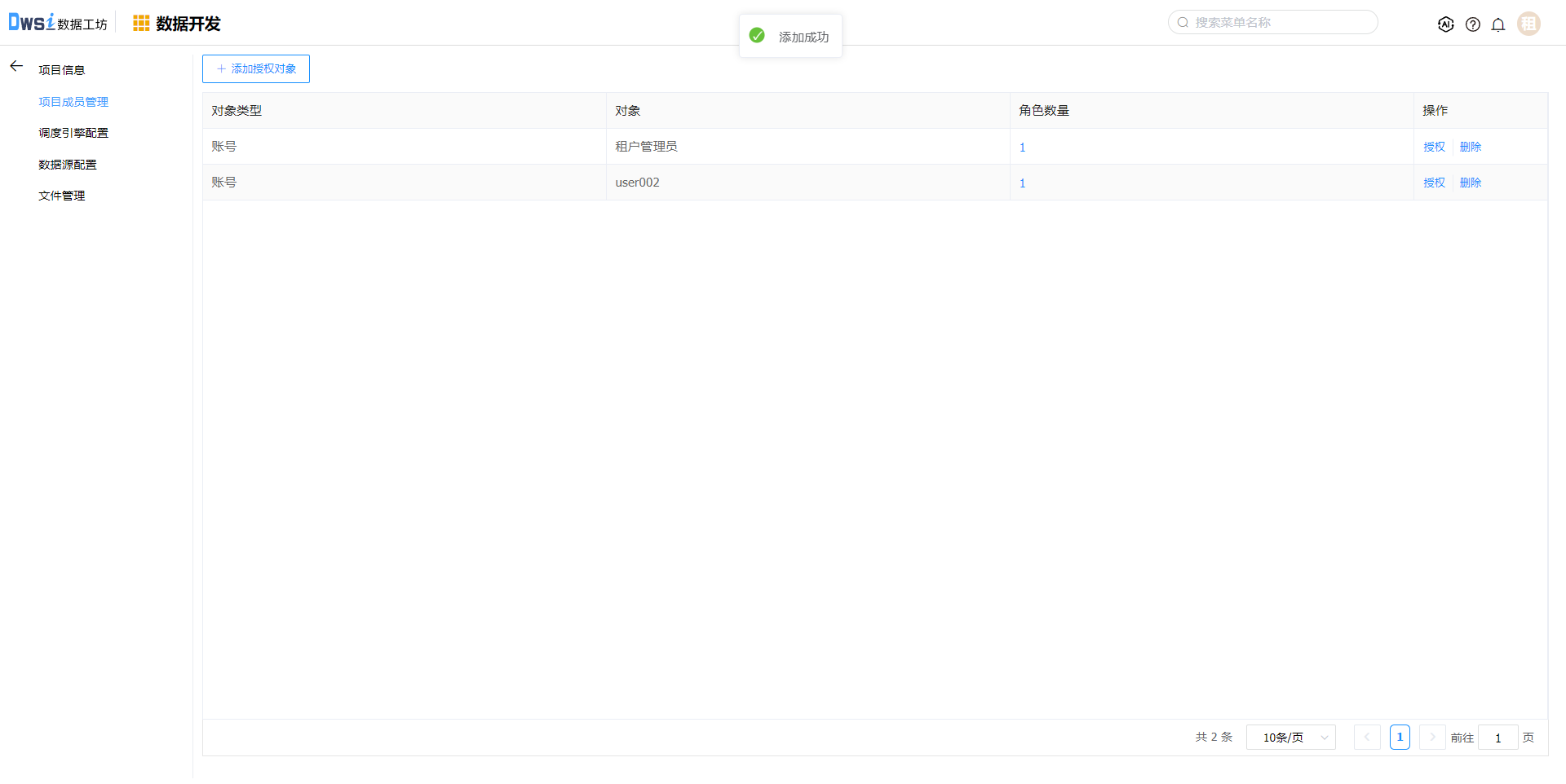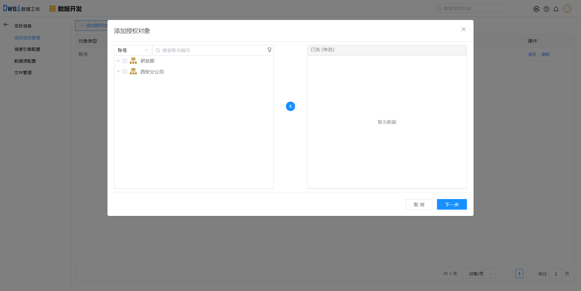 租户选择之前创建的租户,则该项目后续配置的调度引擎、成员和数据源资源均来源于该租户,未在该租户的资源无法选择。
