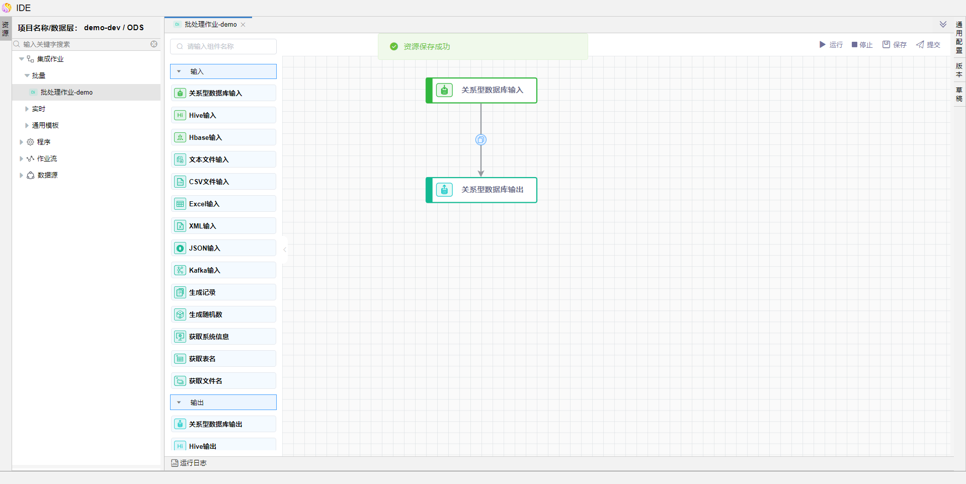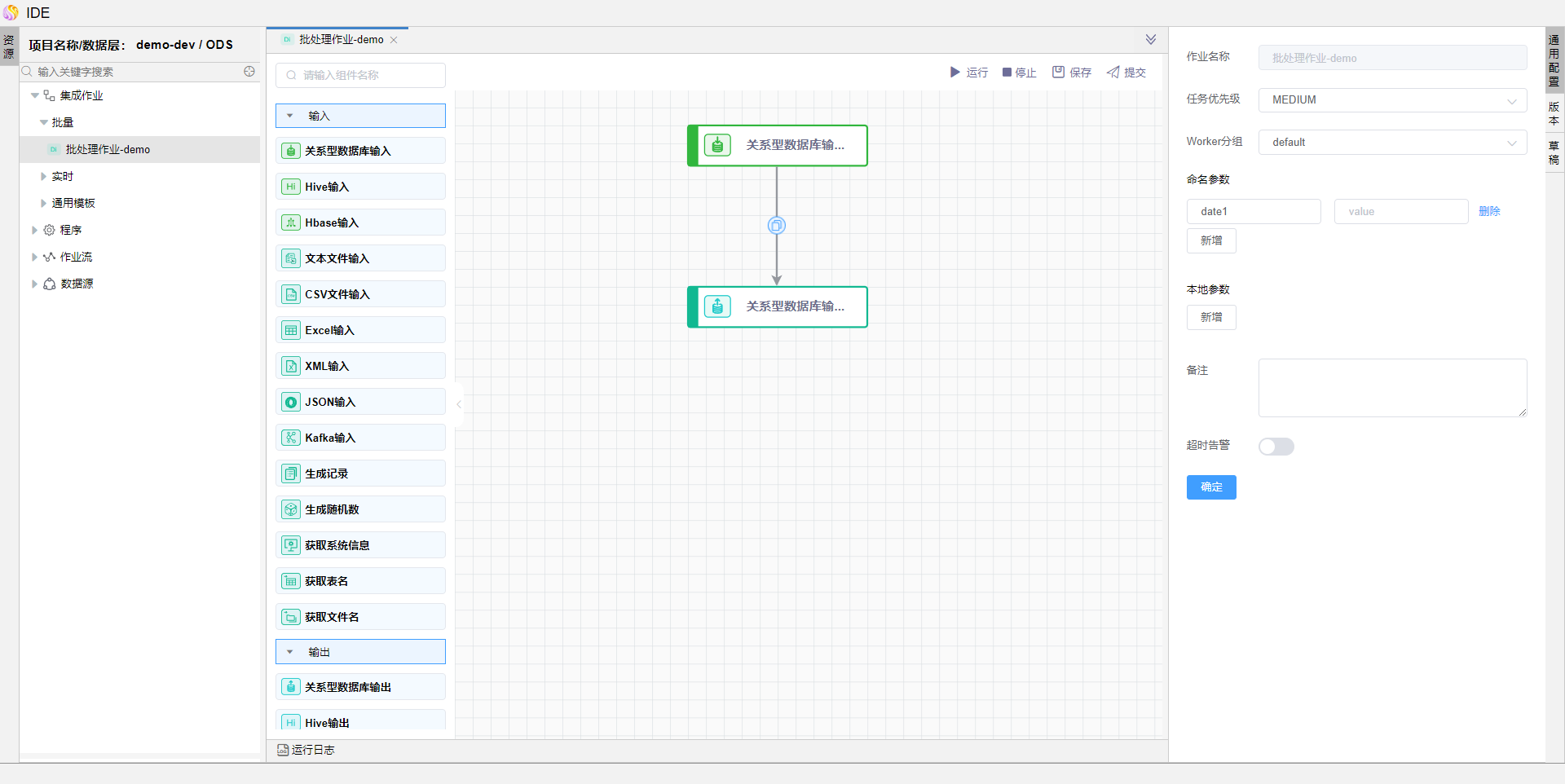 在【数据开发】页面中,点击开发项目的【项目开发】操作,选择ODS层,页面跳转到该项目ODS层的IDE开发页面。
