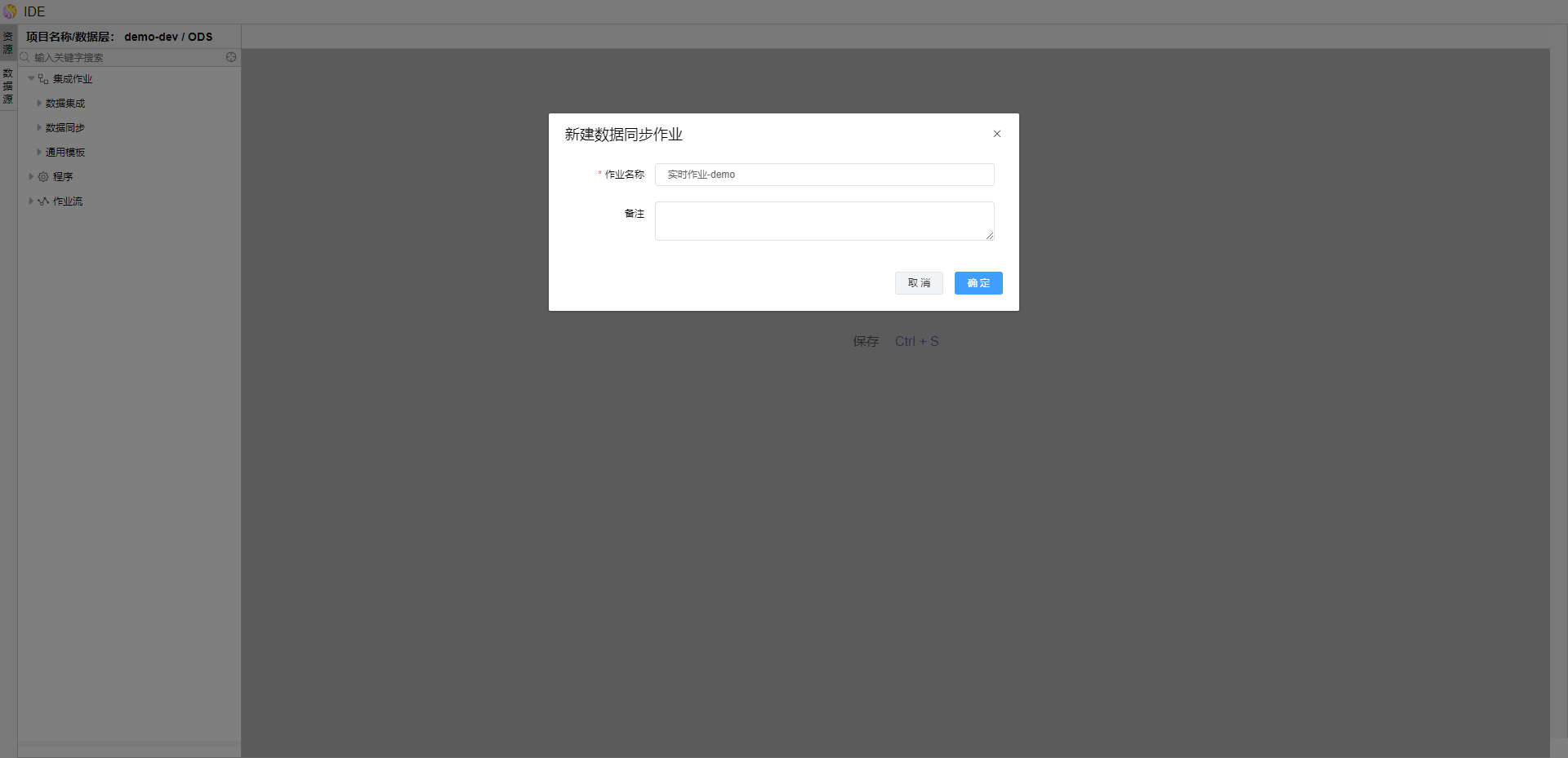 2. 在弹出的【新建数据同步作业】页面,输入作业名称,点击确定按钮。