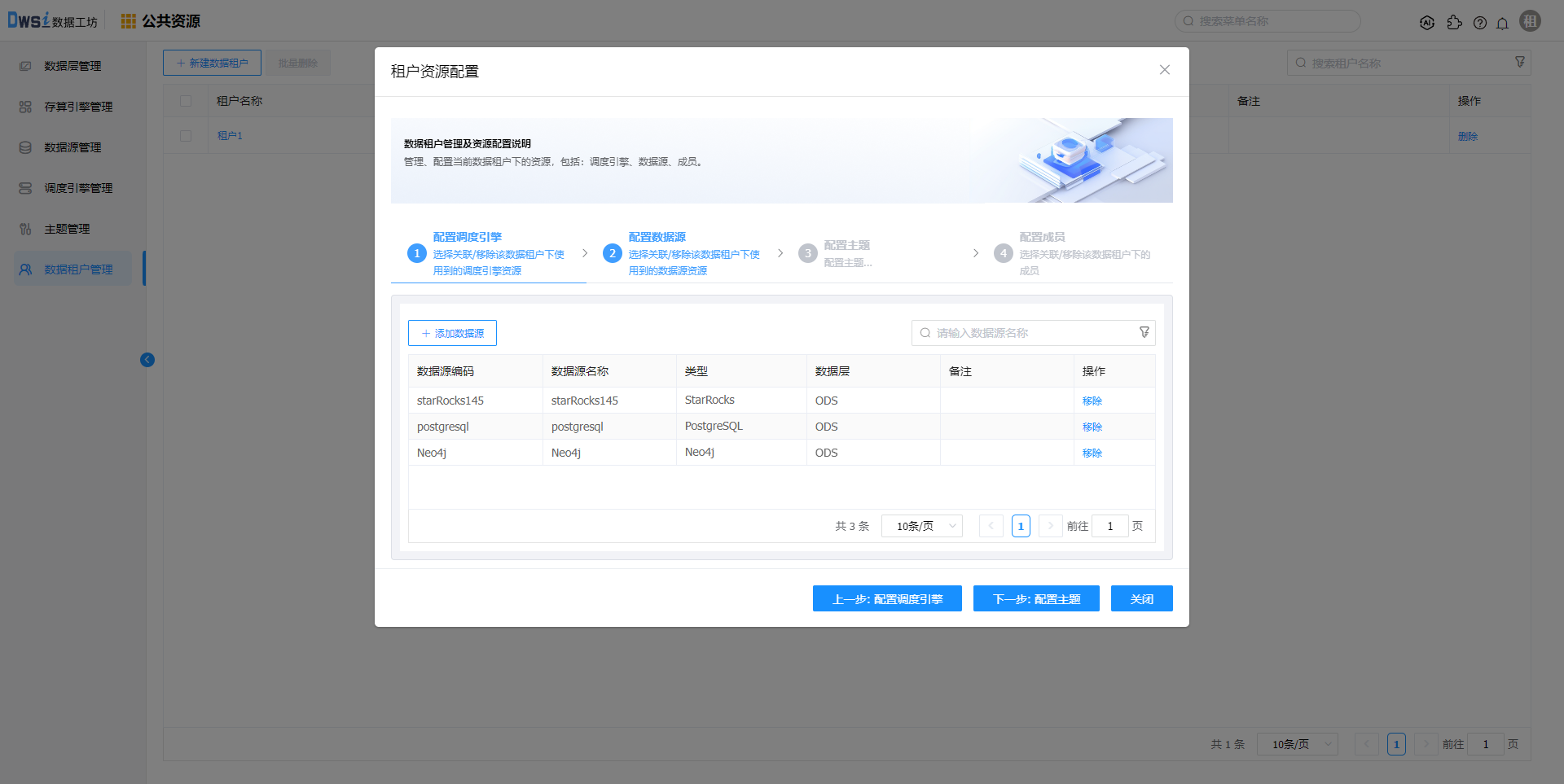 3. 在弹出的【租户资源配置】页面,依次配置调度引擎、数据源、主题、成员