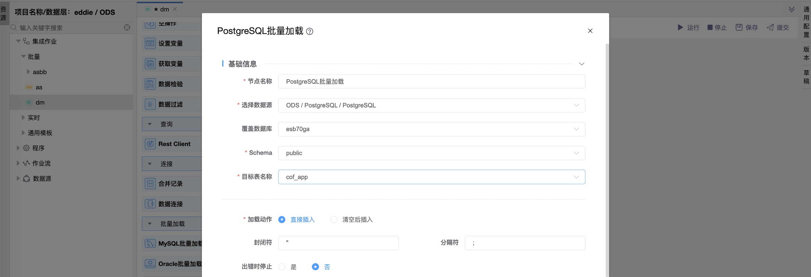 功能介绍:该组件用于将数据快速导入PostgreSQL数据库。PostgreSQL的批量加载是一个实验性的步骤,我们将使用“COPY data from STDIN”将Kettle内部的数据流传输到psql命令中。