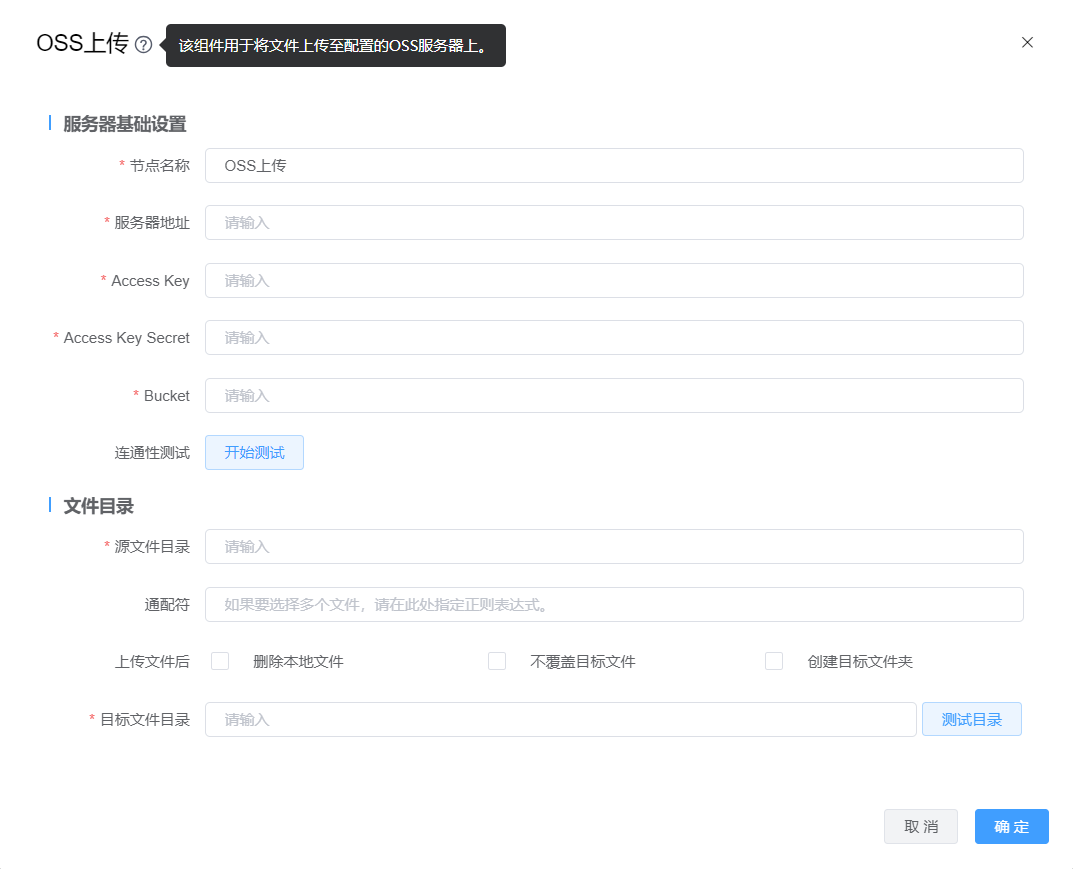 功能介绍:OSS上传用于将文件上传至配置的OSS服务器上。