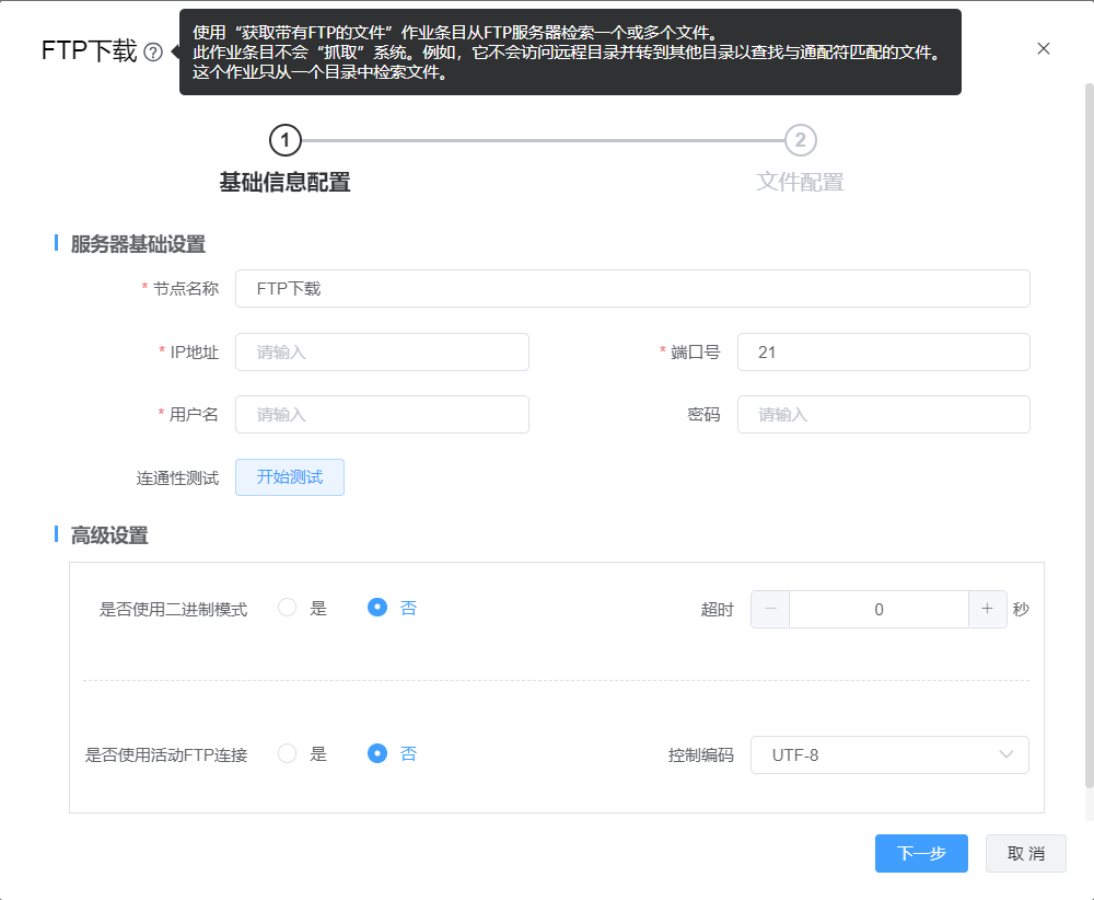 功能介绍:FTP下载用于从FTP服务器检索一个或多个文件。