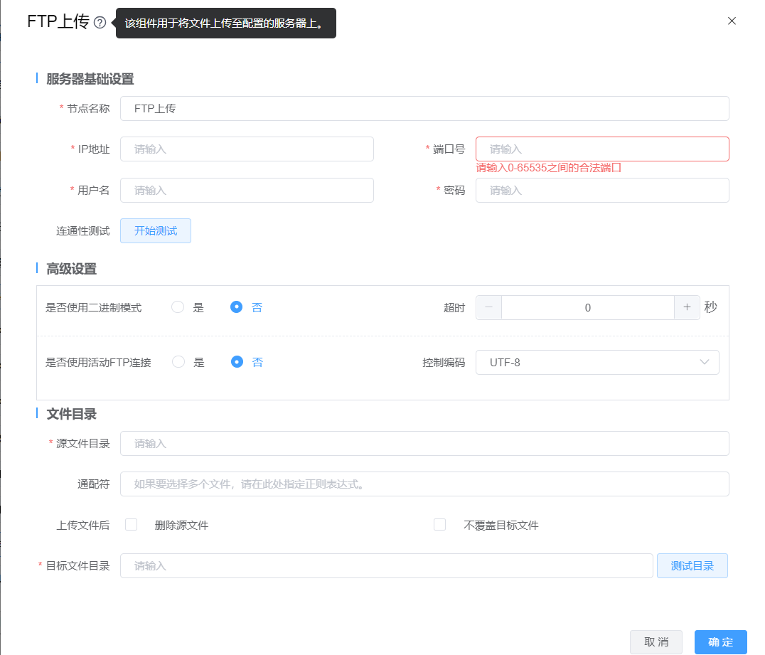 功能介绍:FTP上传用于将文件上传至配置的服务器上。