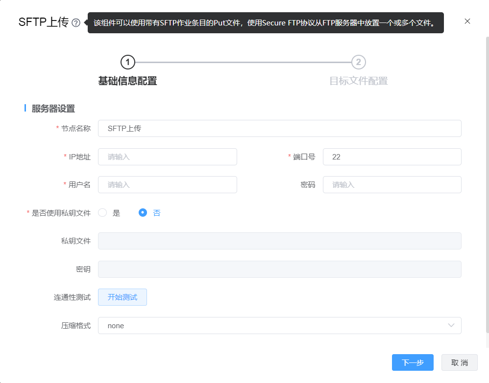 功能介绍:SFTP上传可以使用带有SFTP作业条目的Put文件,使用Secure FTP协议从FTP服务器中放置一个或多个文件。