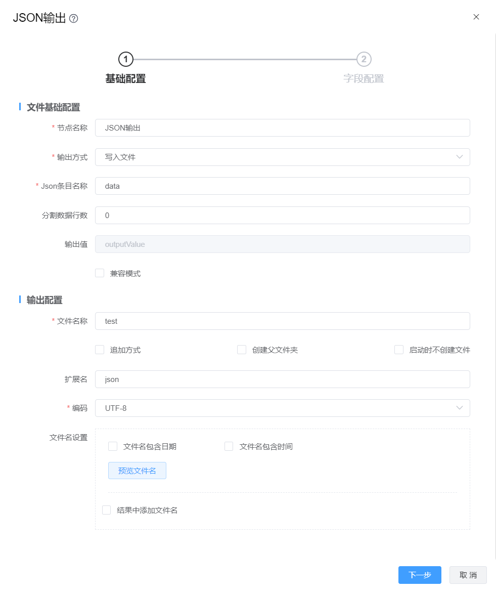 | 元素名称:结果流中字段输出到json文件中对应字段名称 |