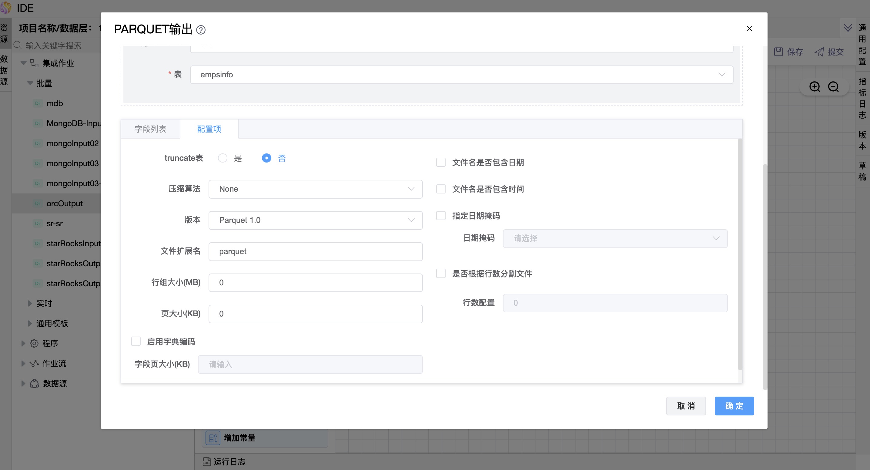 | 配置项 | 压缩算法:指定用于压缩Parquet输出文件的编解码器。 版本:指定要使用的Parquet版本。 文件扩展名:选择输出文件的扩展名。缺省值为parquet。 行组大小:指定行的组大小。缺省值为 0。 页大小:指定数据的页面大小。 启用字典编码:指定字典编码,它构建列中遇到的值的字典。列的数据页之前,首先写入字典页。请注意,如果字典的大小大于Page大小(无论是大小还是不同值的数量),则编码方法将恢复为普通编码类型。 字段页大小:使用字典编码时指定页面大小。默认值为 1024。 文件名是否包含日期:在文件名中添加系统日期。 文件名包含时间:将系统时间添加到文件名中。 指定日期掩码:指定日期和时间格式。 |