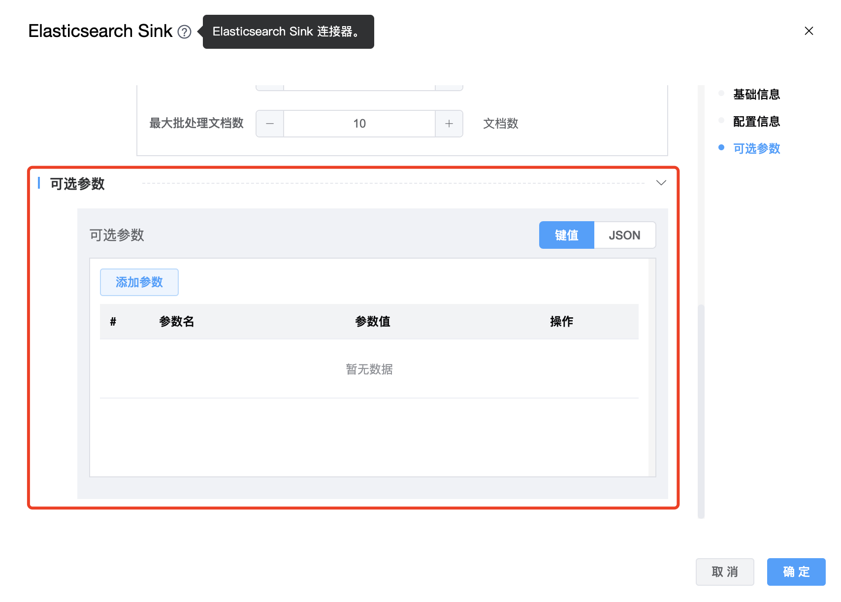 | 可选参数 | Elasticsearch Sink 的其他参数,用户可以根据需求进行配置。 |